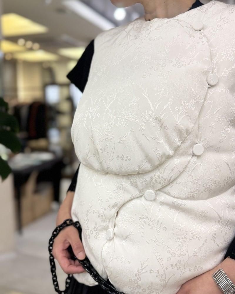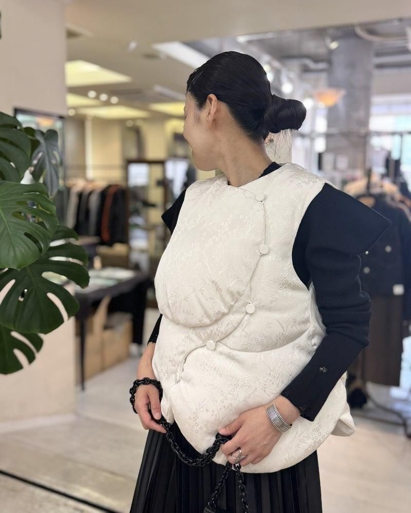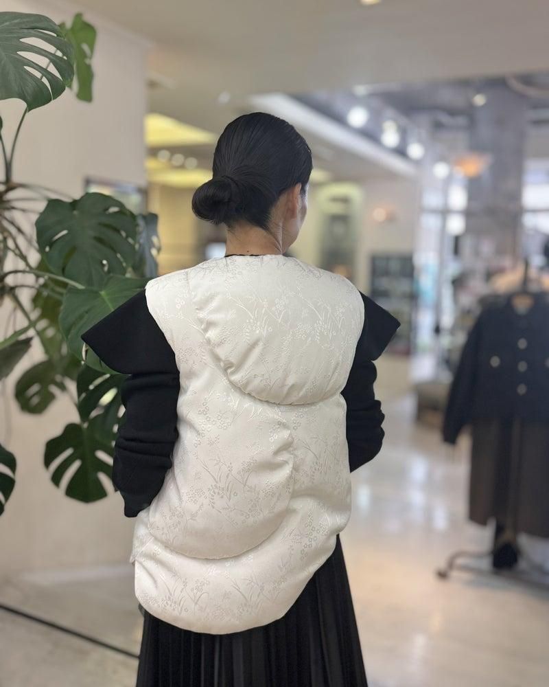 豊かな自然の中で咲く野草模様が踊るジャカードダウンベスト。