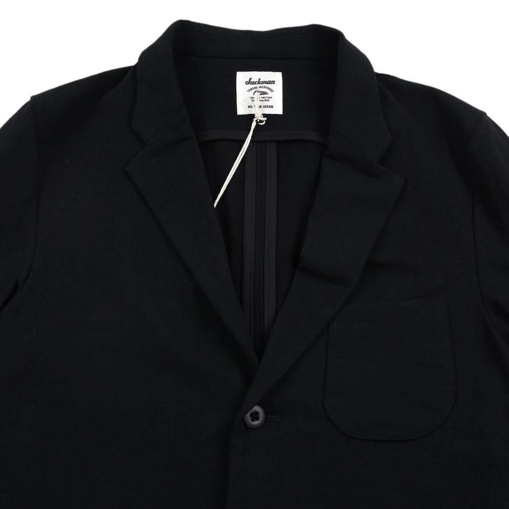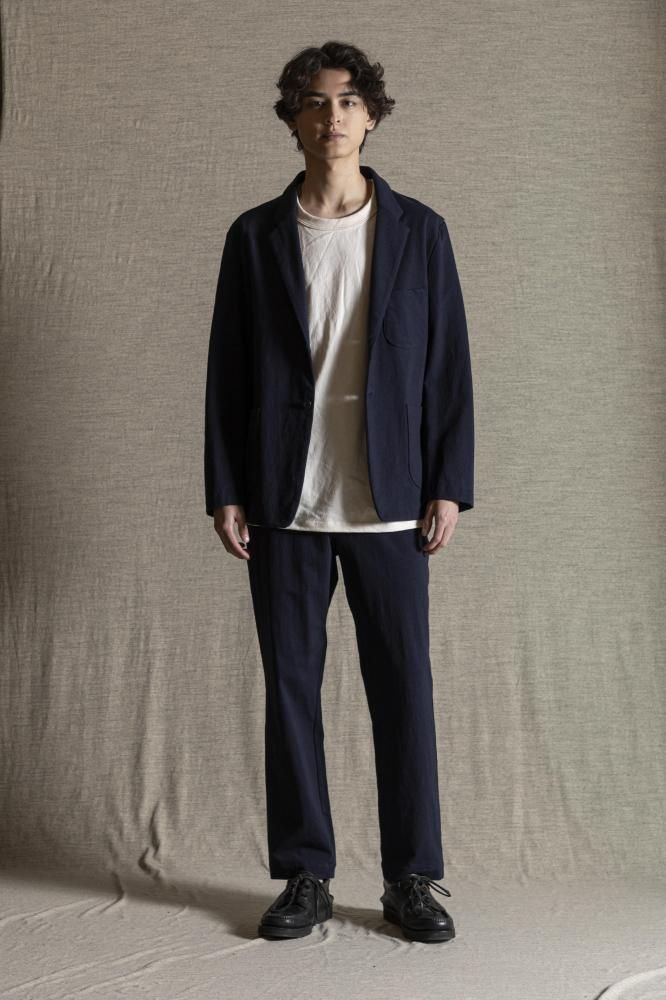 伸縮性の高いポリウレタン糸を綿糸でカバーリングした糸を高密度で編立てた素材を使用したテーラードジャケットです。肌触りは綿特有の柔らかさがありますが、高密度で編み立てることでハリ感が出て季節を問わず着用できます。度目をしっかり詰めることで肘の抜けがほとんどなく型崩れも起きにくいのが特長です。またストレッチ天竺素材は着用時に窮屈感がなく、身体の動きに合わせて適度に伸縮しますので動きやすく、光沢感を抑えることで同素材のトラウザー(JM4955)と組み合わせてビジネスでも着用できます。