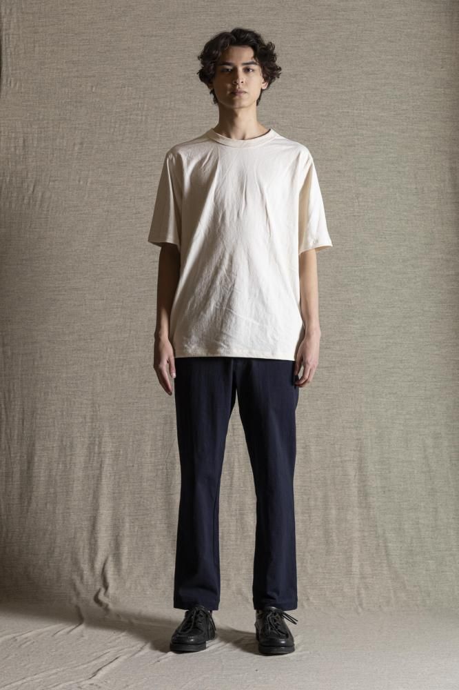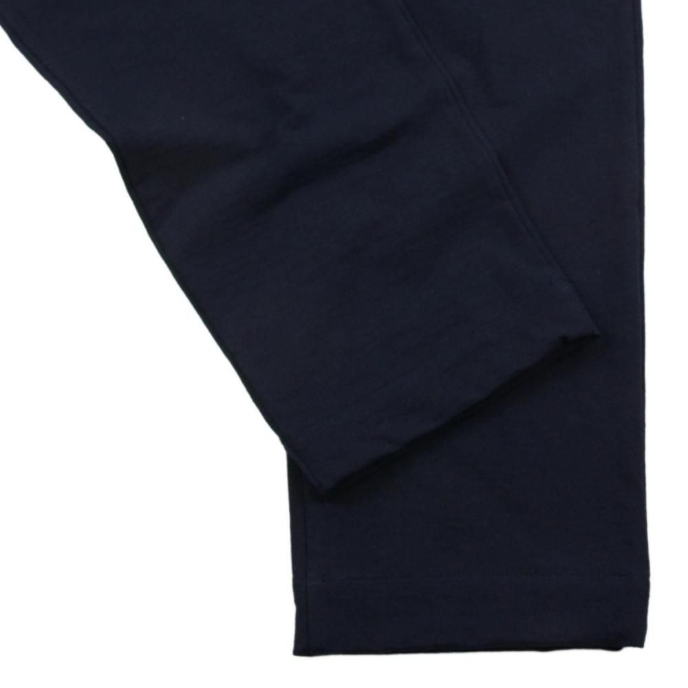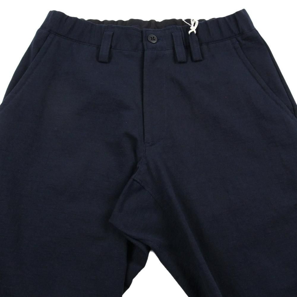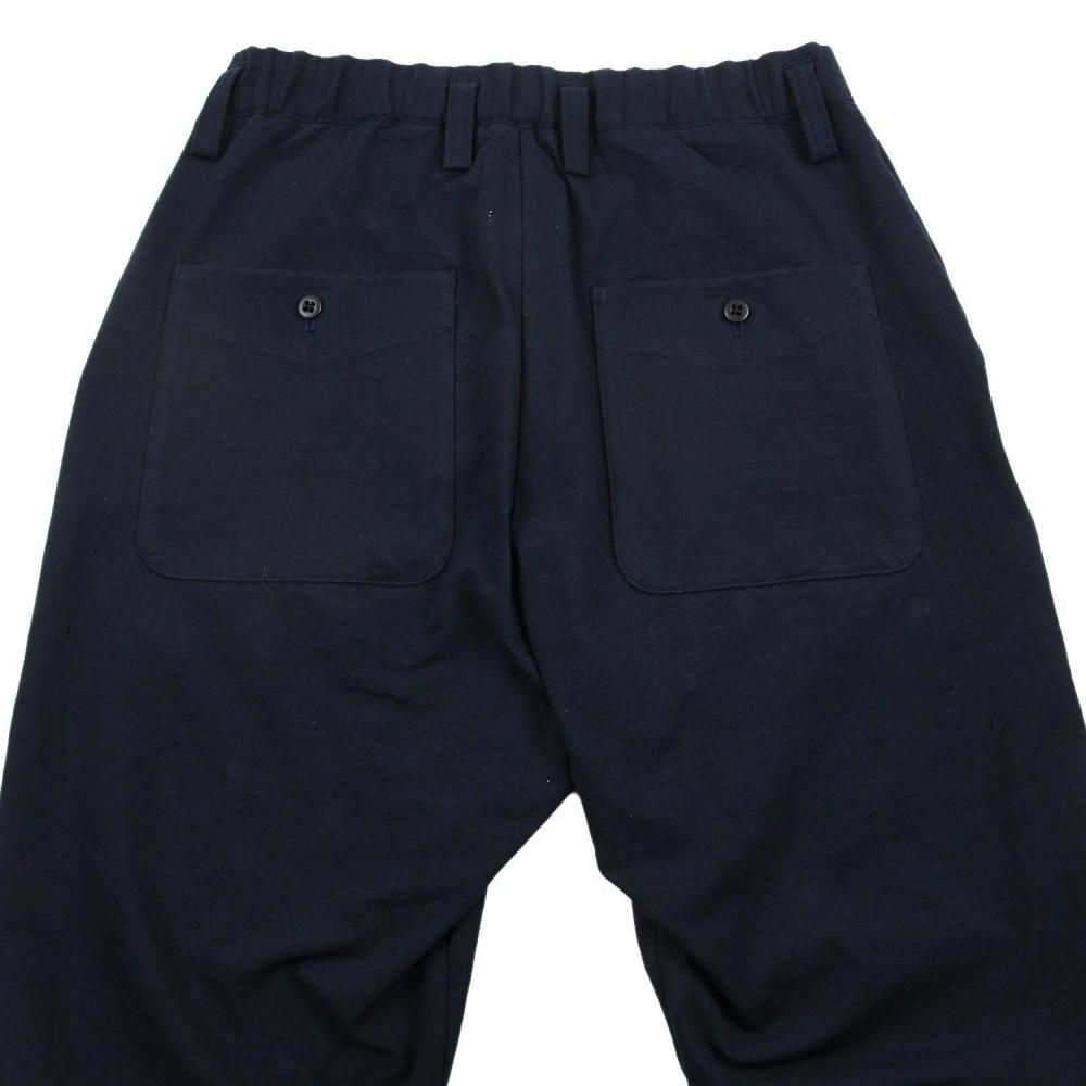 伸縮性の高いポリウレタン糸を綿糸でカバーリングした糸を高密度で編立てた素材を使用した新品番ペグトップトラウザーです。肌触りは綿特有の柔らかさがありますが、高密度で編み立てることでハリ感が出て季節を問わず着用できます。度目をしっかり詰めることで膝の抜けがほとんどなく型崩れも起きにくいのが特長です。またストレッチ天竺素材は着用時に窮屈感がなく、身体の動きに合わせて適度に伸縮しますので動きやすく、春から秋まで着用できます。汗をかいたり匂いが気になる季節でも家庭洗濯が可能です。
