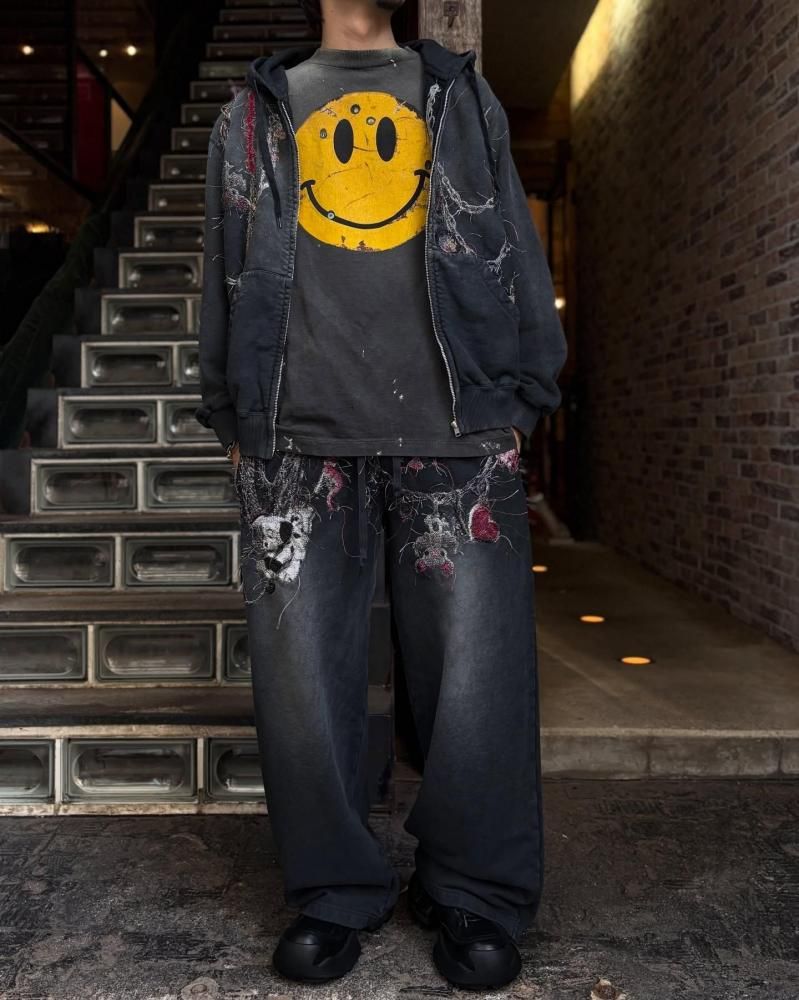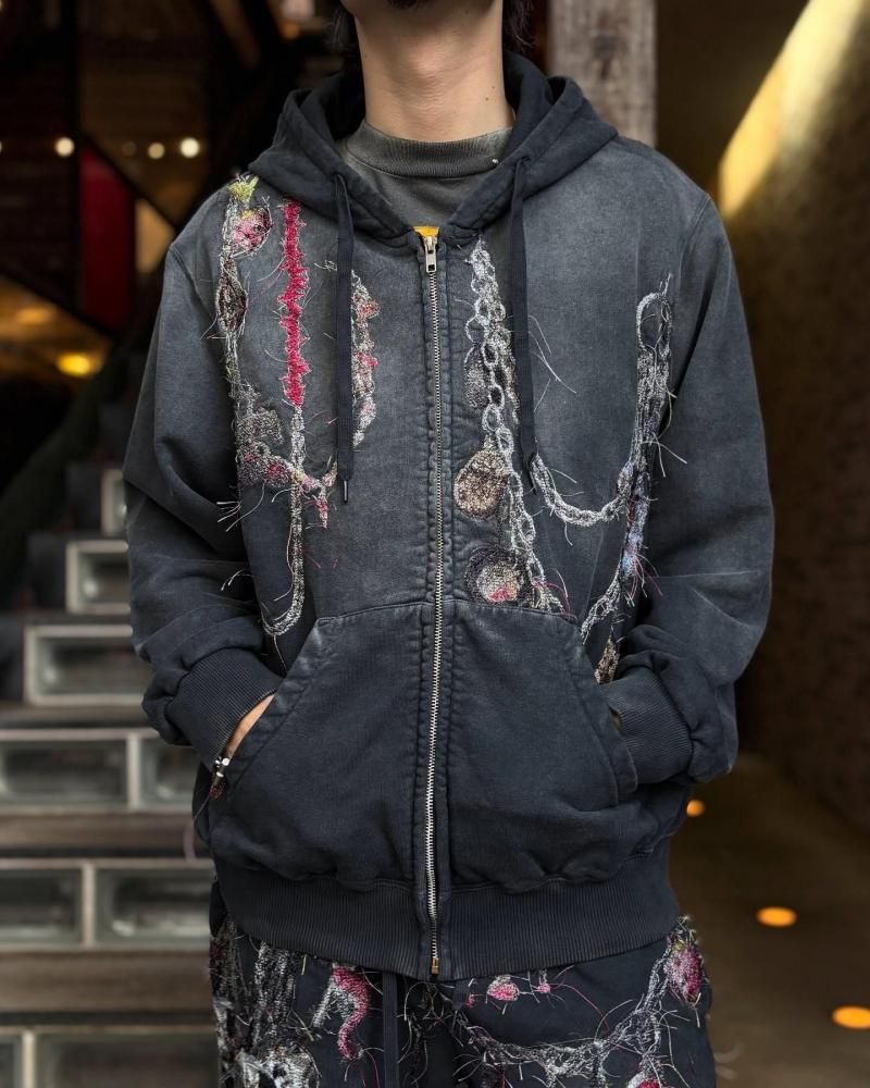 まるでチェーンアクセサリーをまとったかのようなジップアップフーディー。しかし、よく見るとそれは精巧な刺繍で表現されたもの。犬やハートなどのモチーフが散りばめられており、細やかな遊び心が詰まっています。