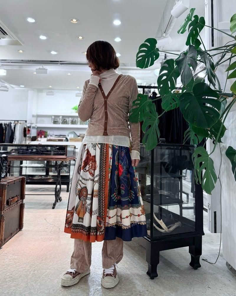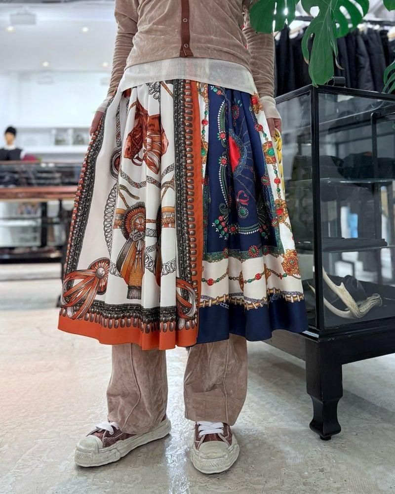 エステルスカーフ柄プリントミックスギャザースカート 04