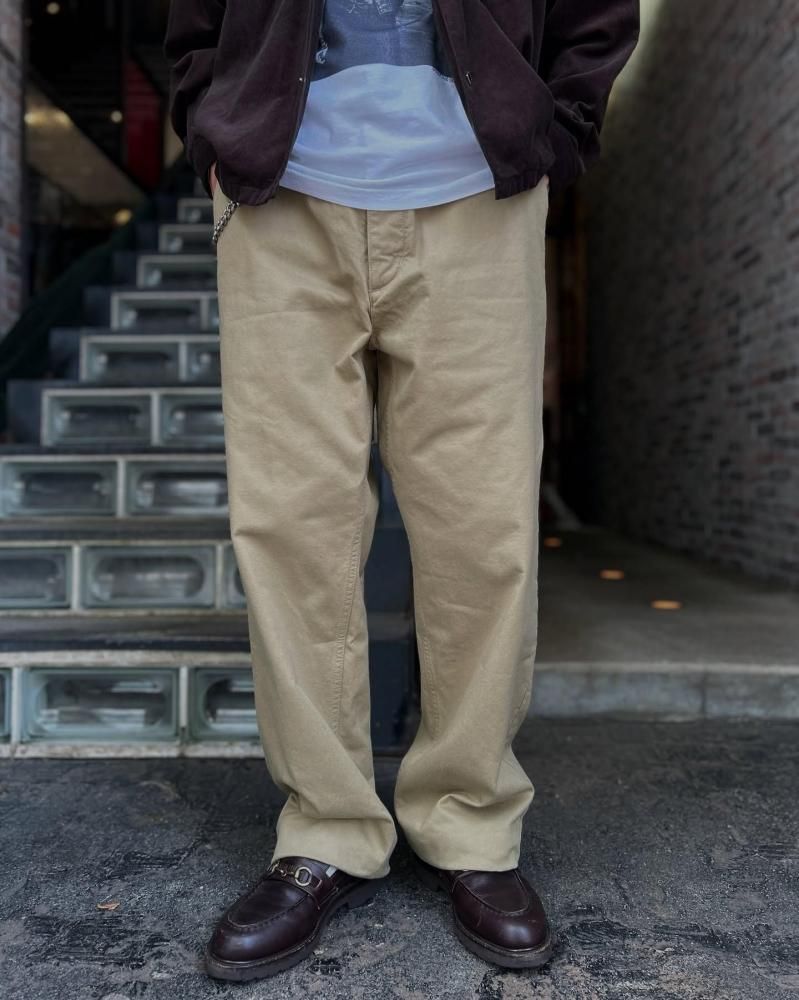 こだわりのウォッシュド加工を施すことにより生地に表情を与え、まるではじめから履き込んだかの様な存在感を醸し出す。ステッチワークや裏側など細部にもこだわった、リラックスシルエットのチノトラウザーズ。