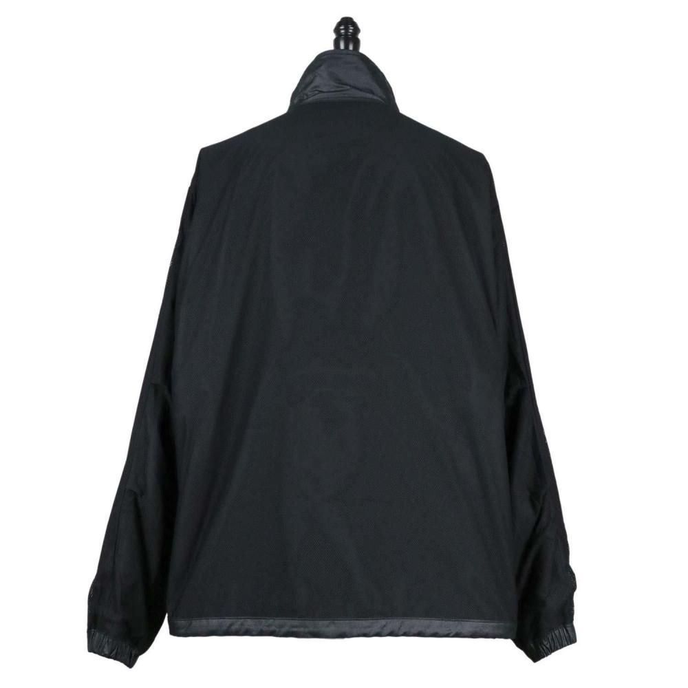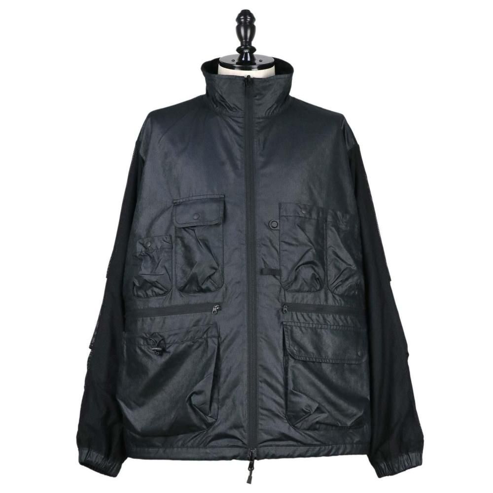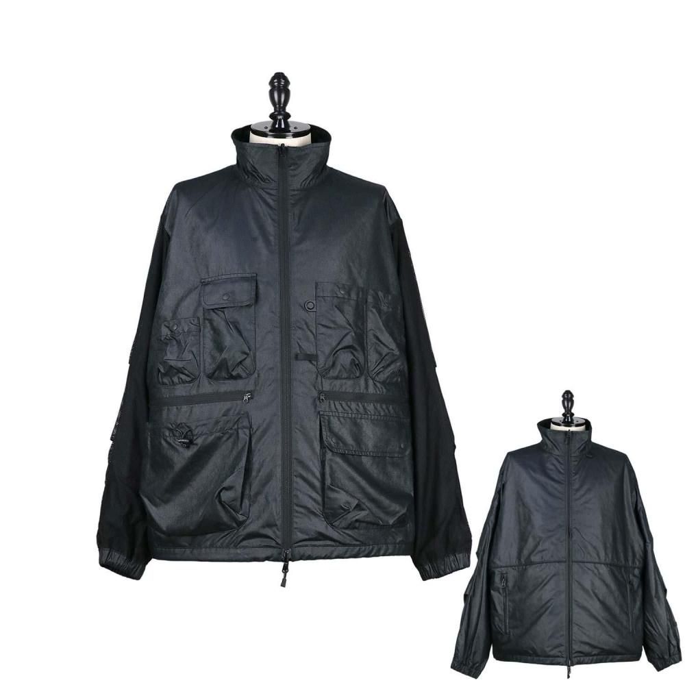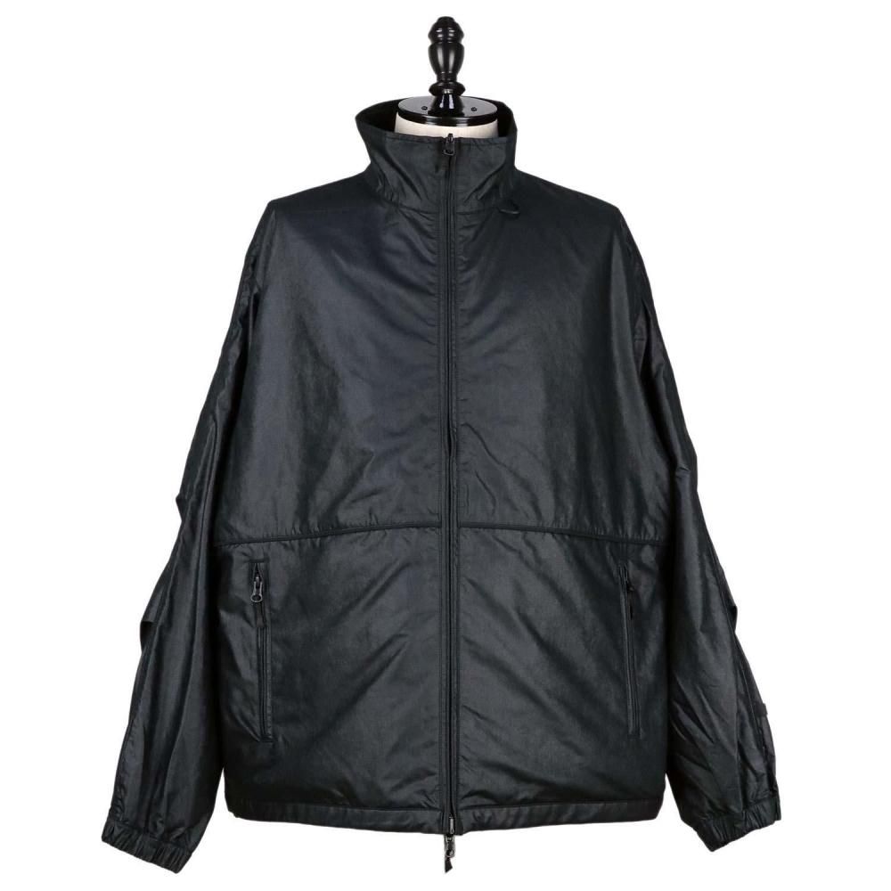 オイルドファブリックを彷彿とさせるようなテクニカルな生地にてアレンジ。フロントにはサイドポケット、フラップポケット、インナーには複数のインサイドポケットなど、様々なポケットワークを施し、見た目以上に収納力の高いトラックジャケット。内側は総裏メッシュ仕立てで、ドライタッチに着用できるのもポイント。ミニタリーディテールの特徴である前振りの袖も
