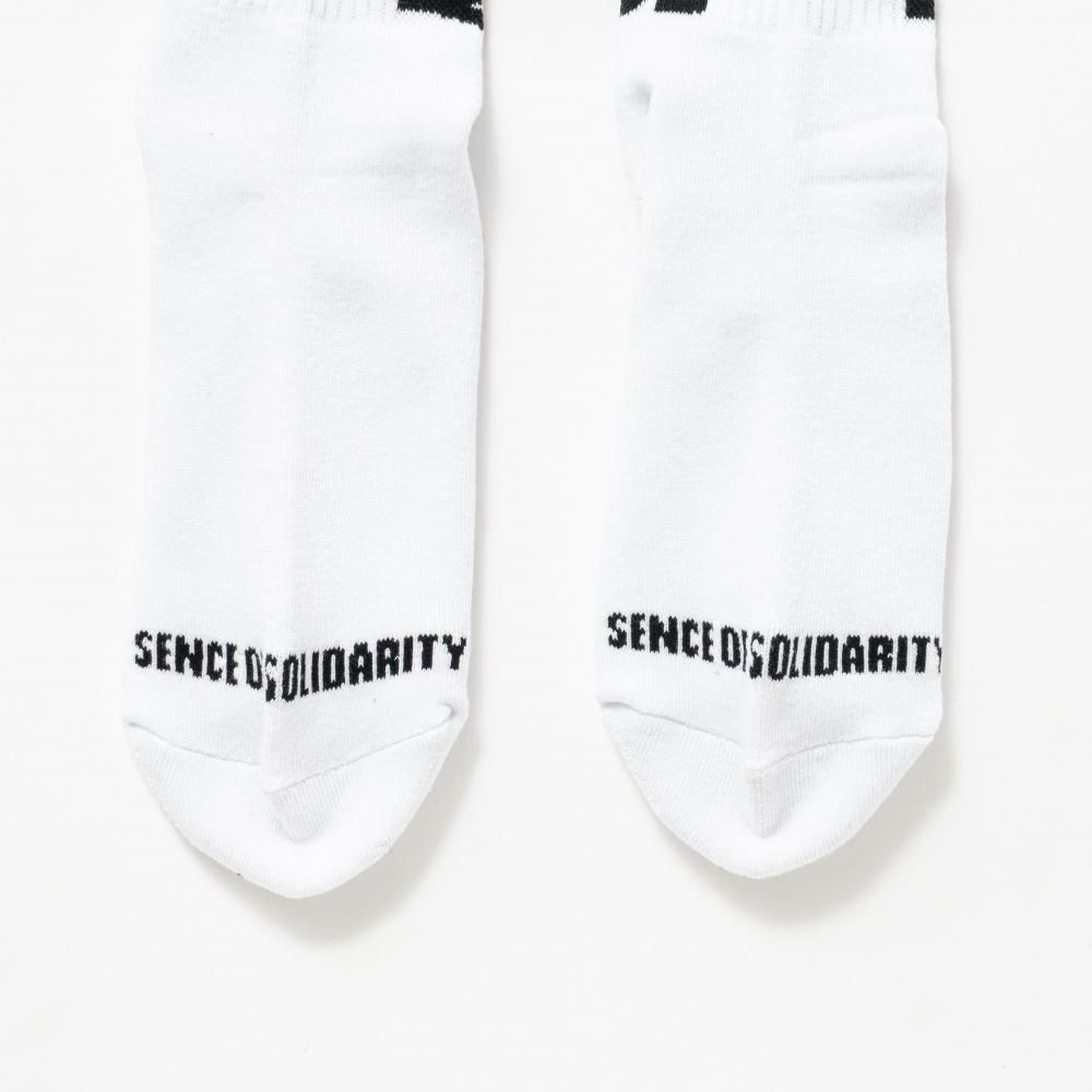 コットン/アクリル混紡の滑らかな質感のパイル素材を使用したハイソックス。レッグに大ぶりなSENCE OF SOLIDARITYロゴをジャガードで表現したデザイン。