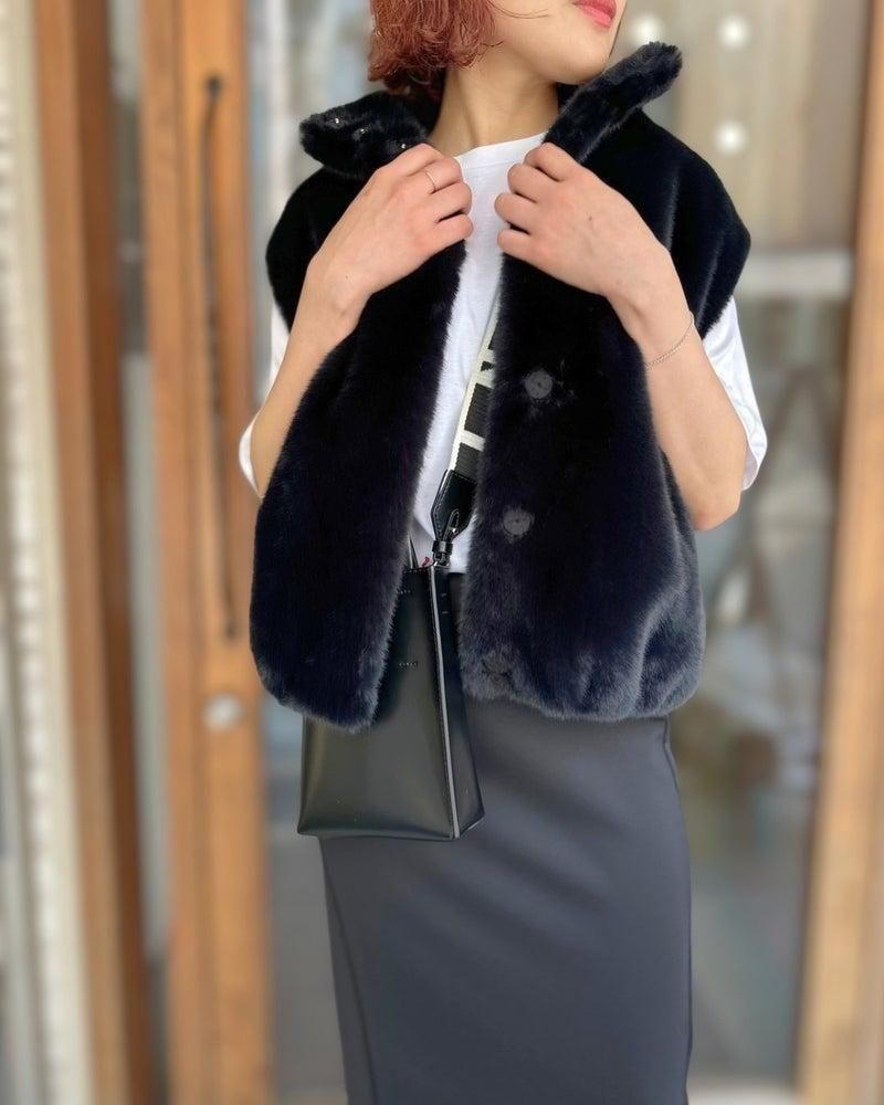 ソフトで包み込むようなフェイクファー生地を使用したベスト。滑らかなミンクのような質感です。このアイテムは、端境期に重ね着するのに最適で、スタンドカラーと比翼仕立ての開閉が、さりげないラグジュアリー感を演出します。