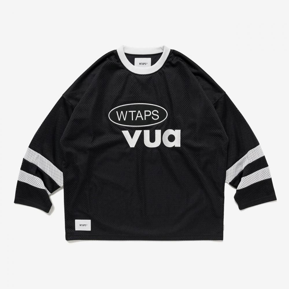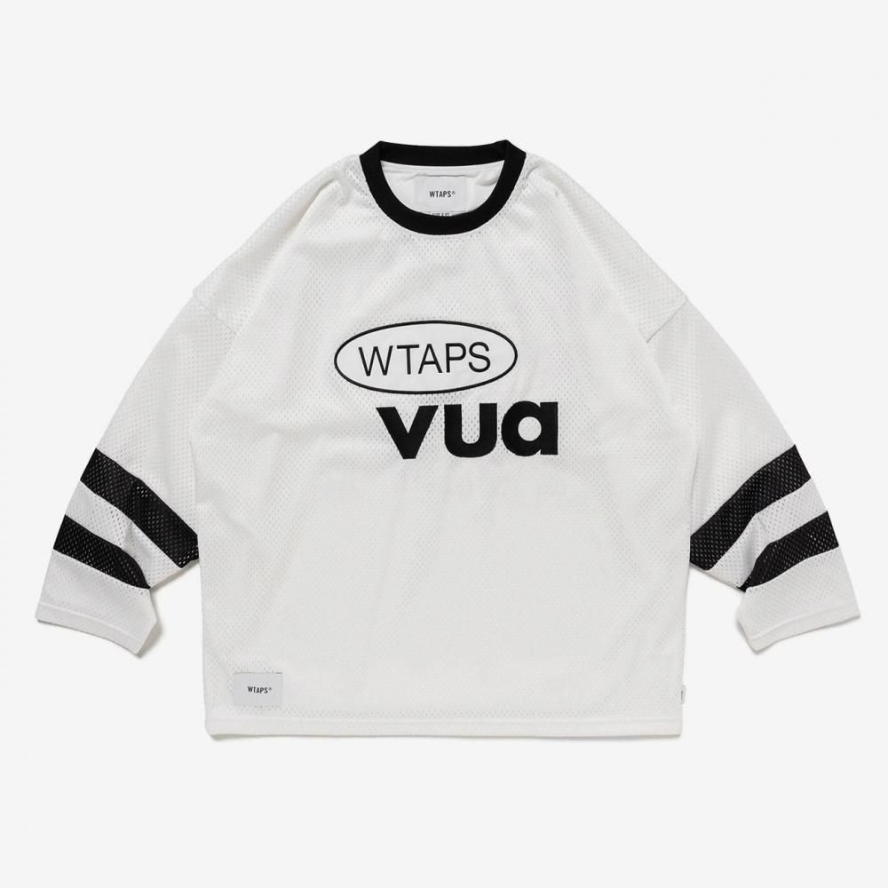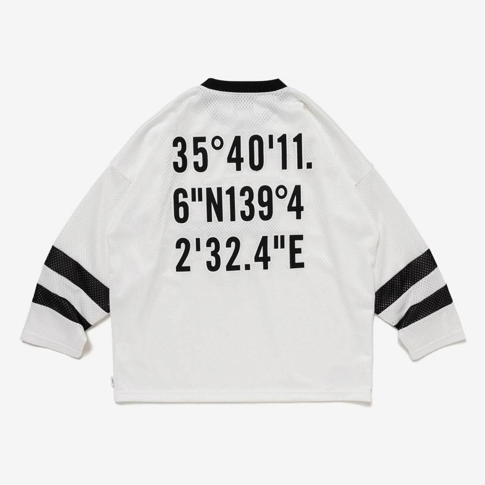 総柄プリントのロングスリーブTシャツに、ひと回り大きいフィットのメッシュを重ねた2レイヤー仕様。コットンジャージー面の前後にプリントモチーフを施し、メッシュから透ける仕様が特徴。