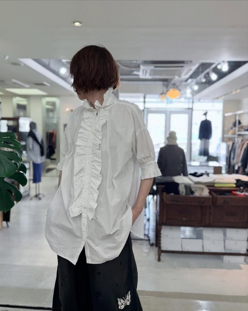 ゆったりとしたサイズ感のコットンブラウスに、フリルがデザインされることで
