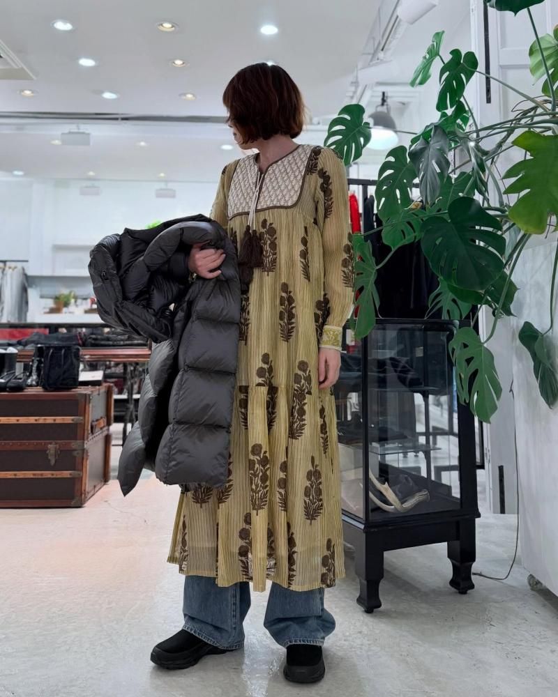 ヨーク部分は中綿入りのキルティングと秋を感じさせるカラーのドレスは、主役になる一着。
