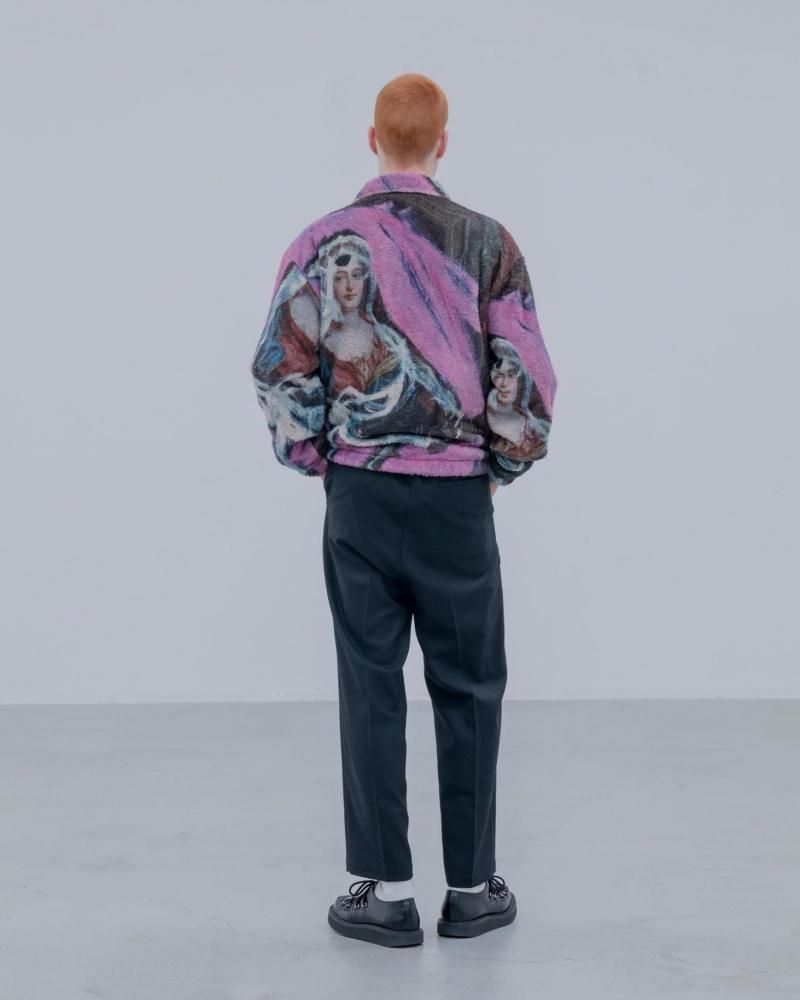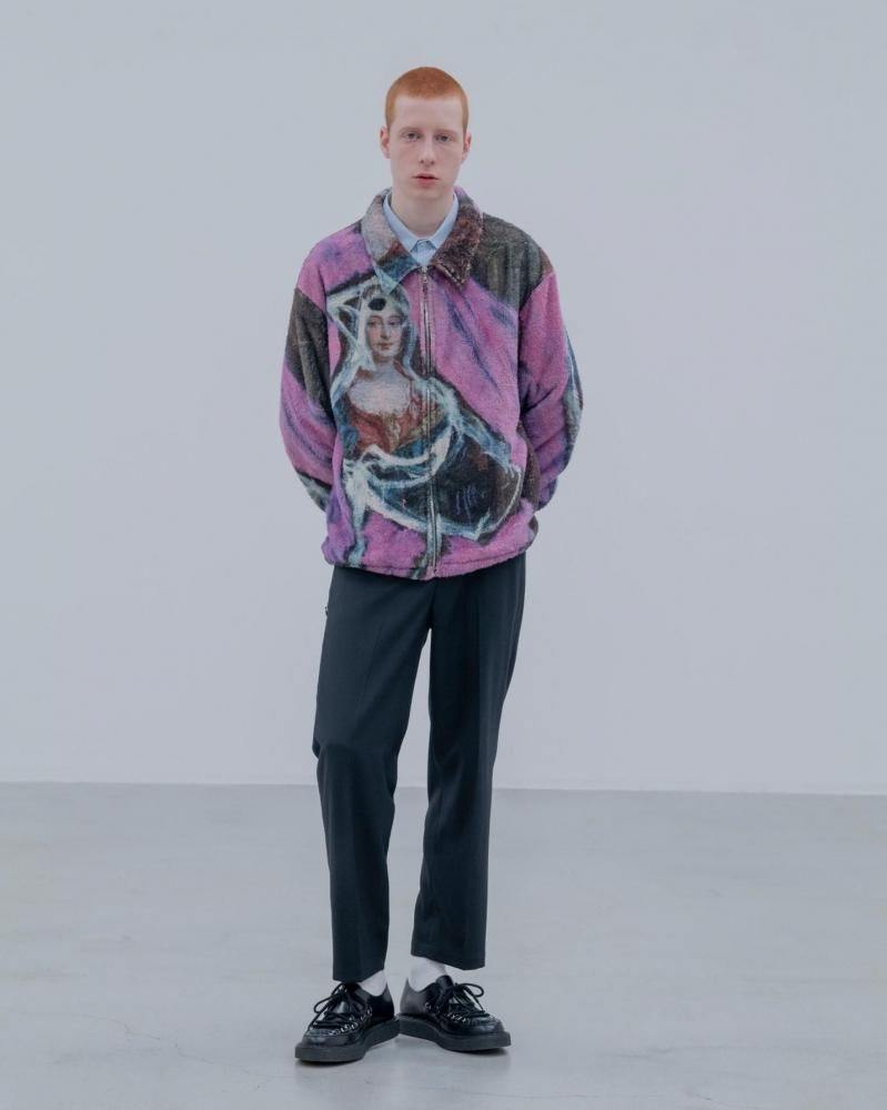 こちらは2種のヨルン作品を全面に転写プリントしたマイクロファイバーフリースのブルゾン。ガレージセールで買った油絵の上に描かれた作風がどこか今季のテーマ“UNFINISHED”に通じます。