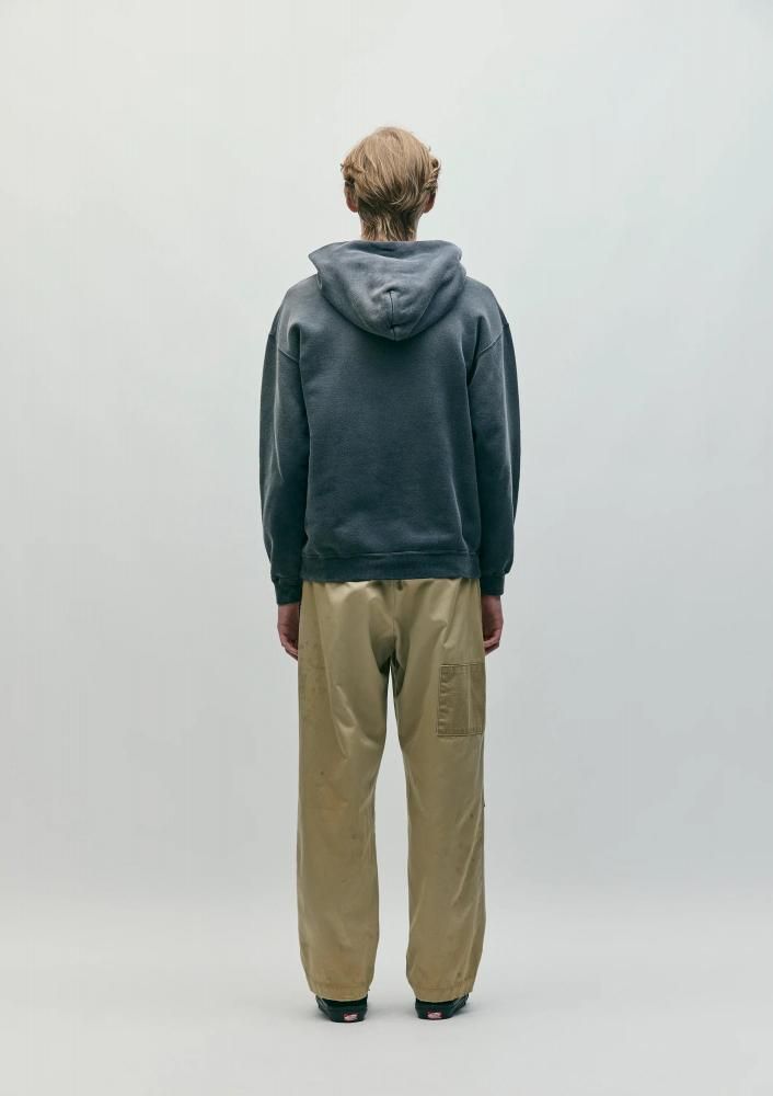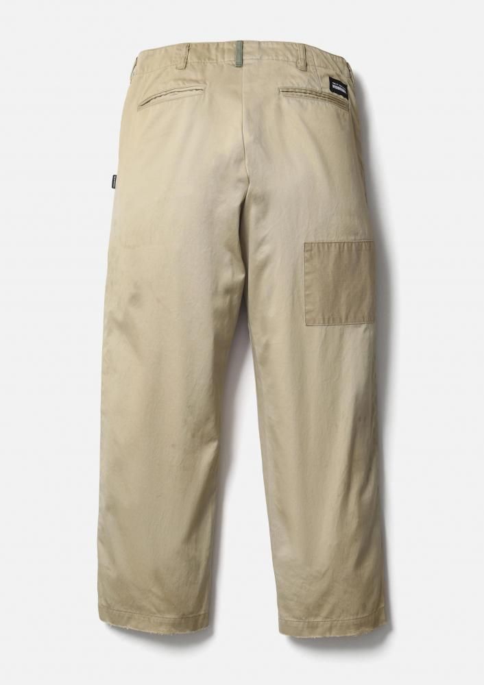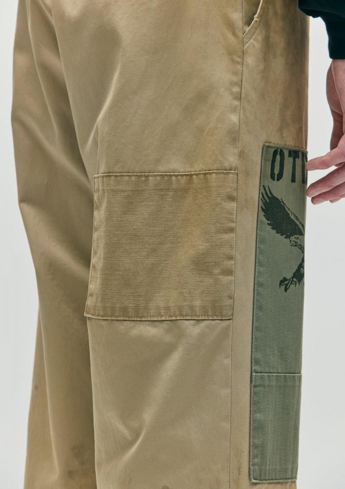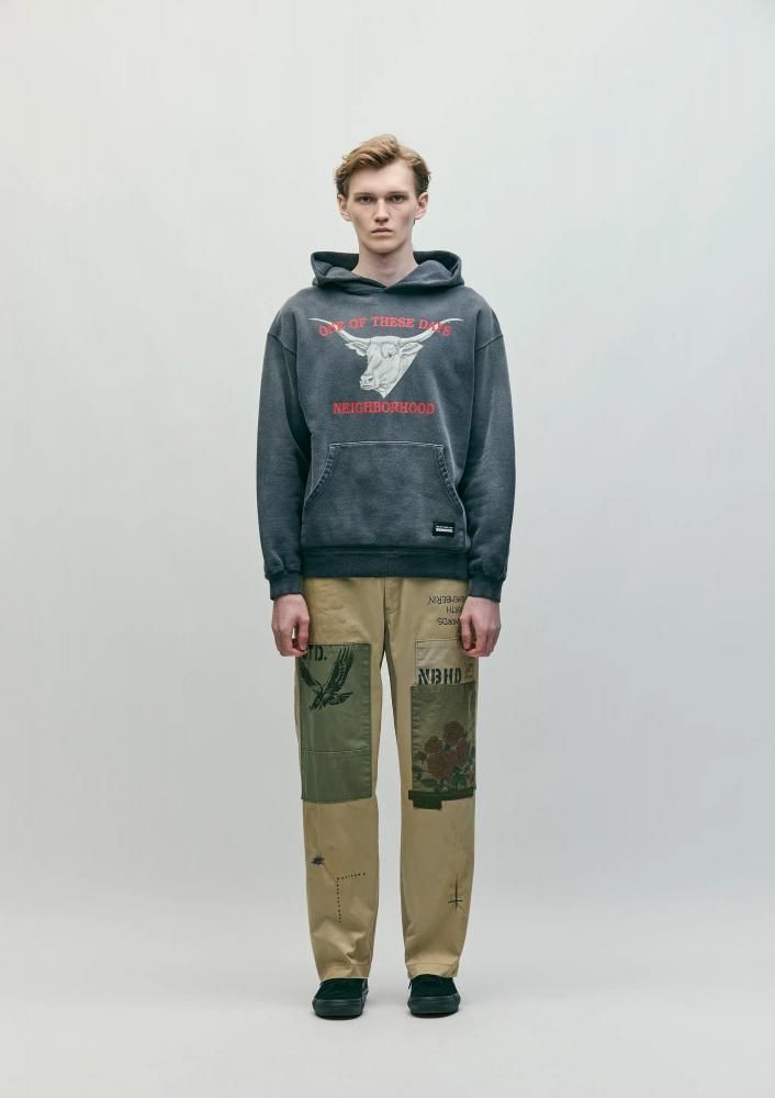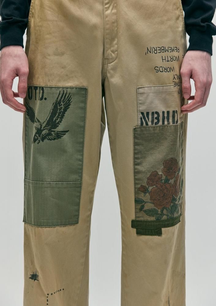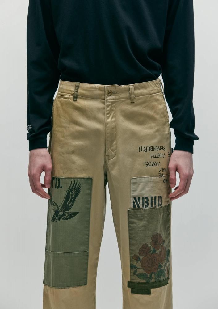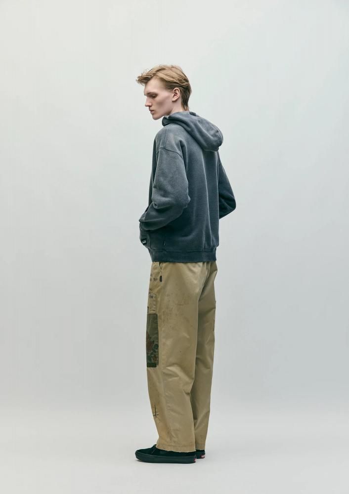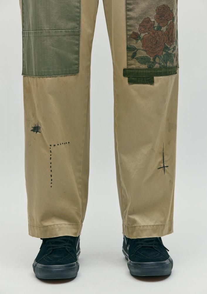 特徴的な光沢とハリ、コシを兼ね備えるタフな高密度織のウエストポイント生地に、サベージ加工を施したチノパンツ。4種類の当て布リメイク、手かがりリメイク、オイル汚し加工を用いてリアルなエイジングを表現。前面にハンドペイント風のモチーフをプリント。オリジナルの4つ穴ボタンを採用し、コラボレーションネーム、サイドシームにピスネームを付属。ロサンゼルス在住のアーティストMatt McCormick(マット・マコーミック)主宰ONE OF THESE DAYSとのジョイントワークアイテム。