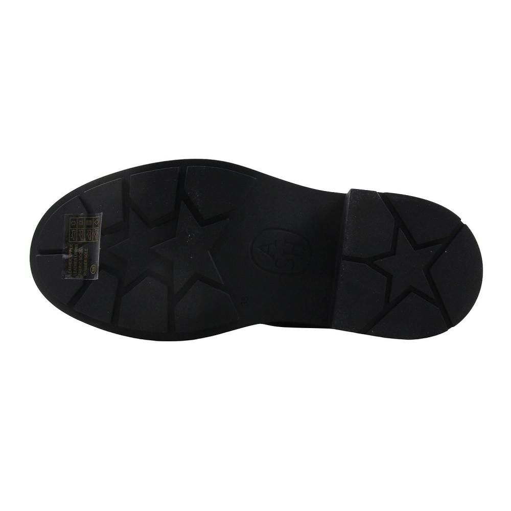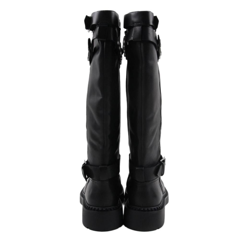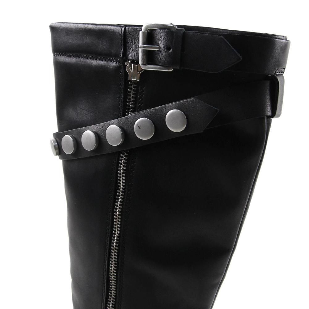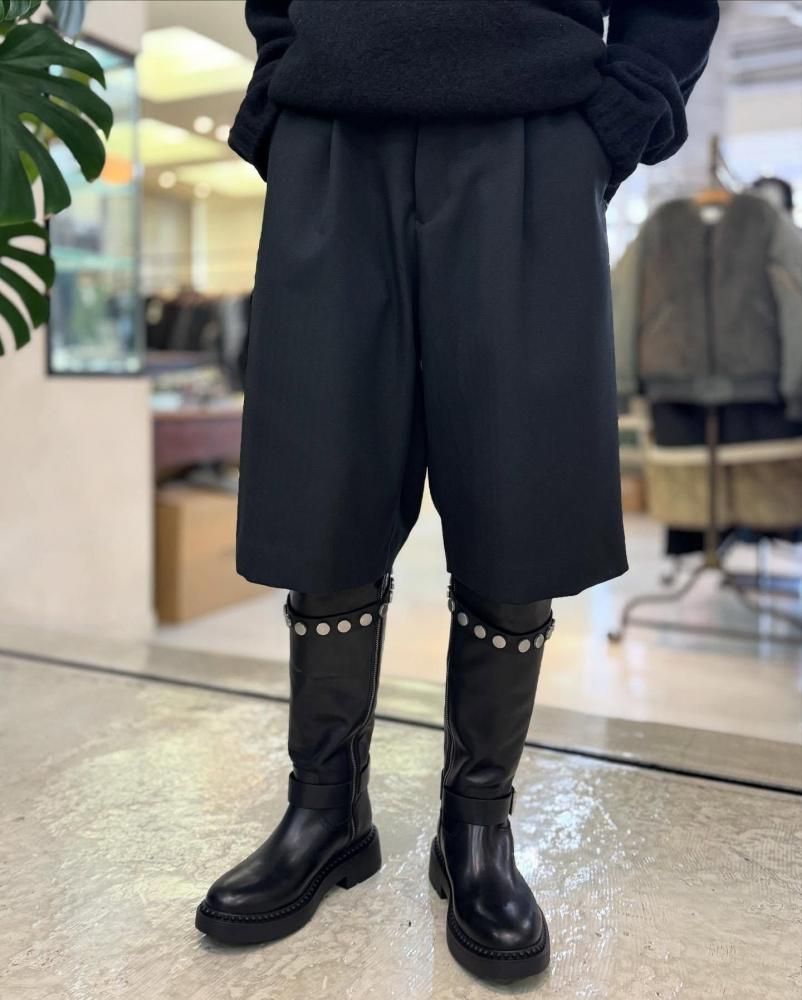 バックルベルトやスタッズデザインが施されたコバなど、デコラティブなディテール。
