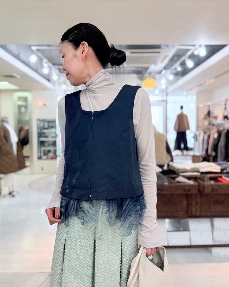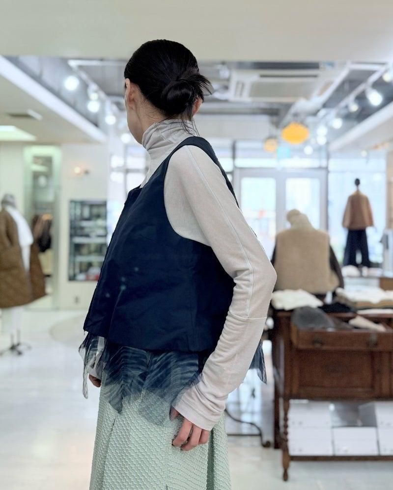 ポリエステルのスポーティーなベストにしなやかなシルクがデザインされたベスト。
