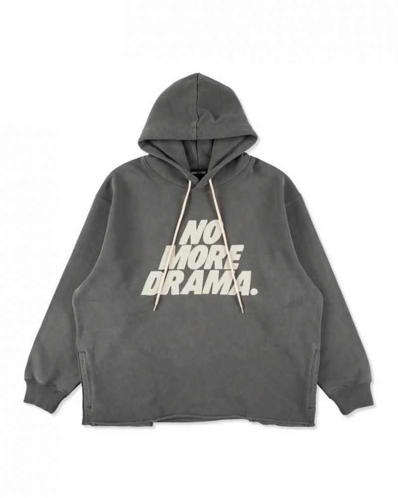 印象的なワード“NO MORE DRAMA”をパッチワークで取り付け、厚手のスウェット生地に加工を施し、裾を切りっぱなしにしたヴィンテージライクな風合いに仕上げています。
