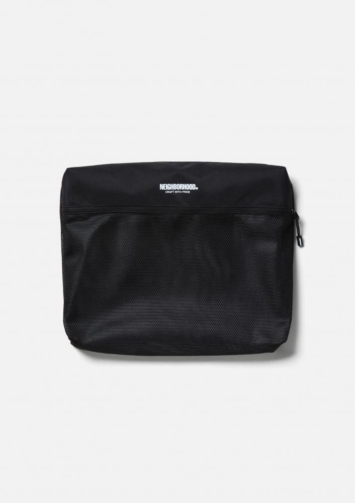 ポリエステルメッシュ素材を使用したメッシュポーチ。別地のポリエステルオックス部分にロゴをプリント。オリジナルのラバー製ファスナープル、ピスネームを付属。トラベルポーチLサイズのインナーとしても使用可能。