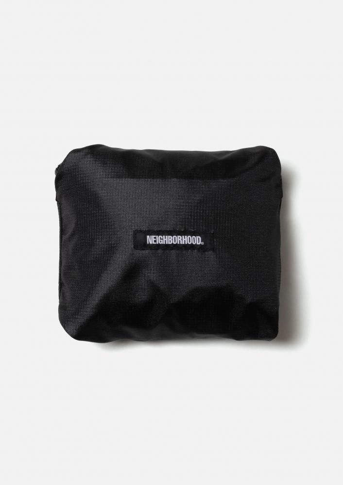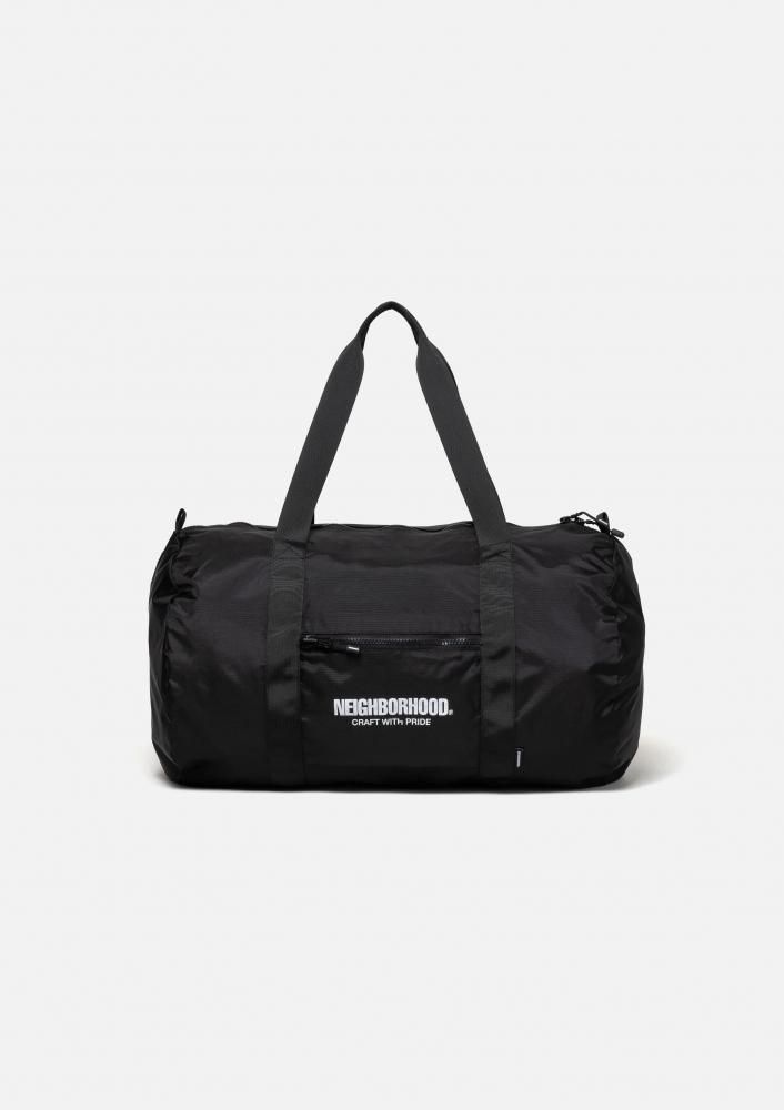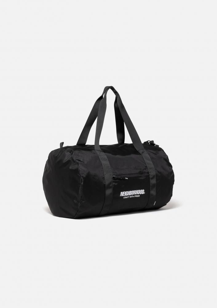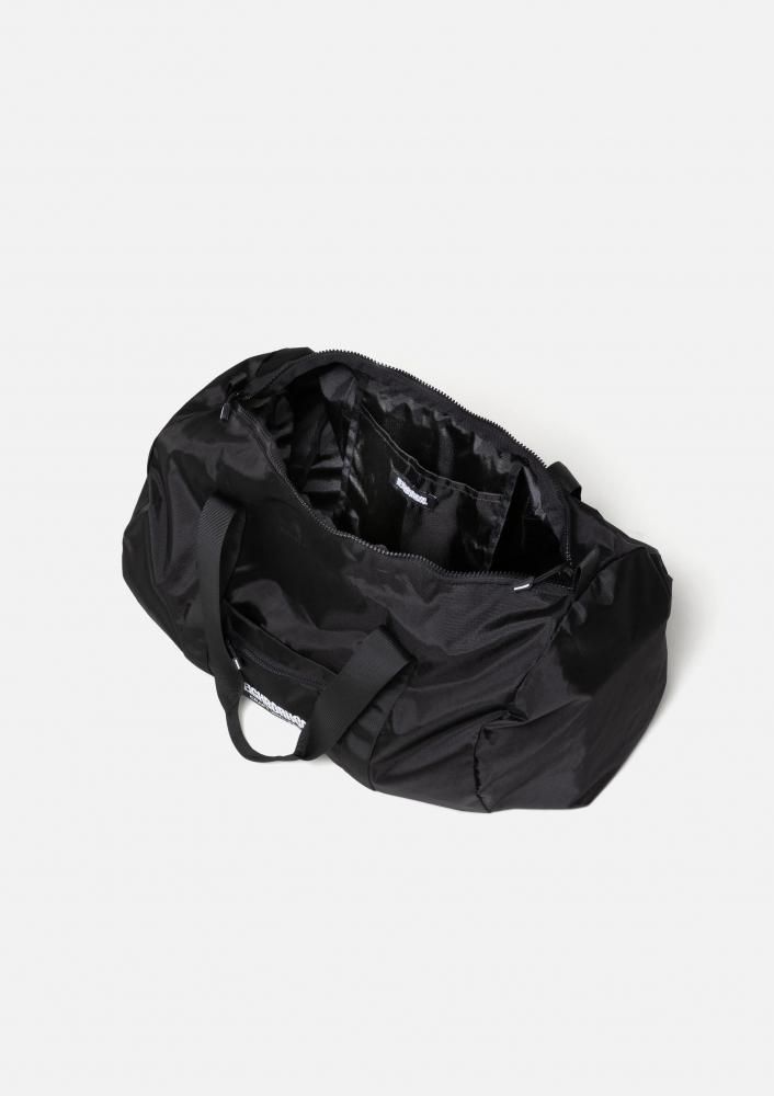 ナイロンリップストップ素材を使用したボストンバッグ。外側のポケットに収納可能なポケッタブル仕様。外側のポケットと本体の間にスーツケースの持ち手を通せるスリーブ付き。フロントにロゴをプリント。オリジナルのラバー製ファスナープルを採用し、ピスネームを付属。