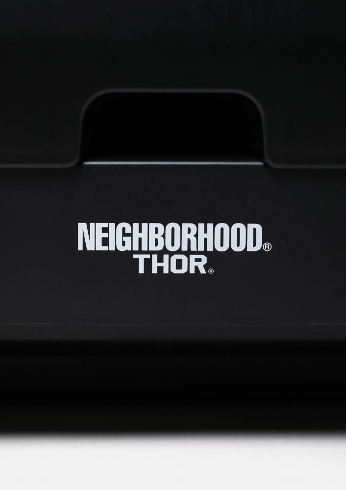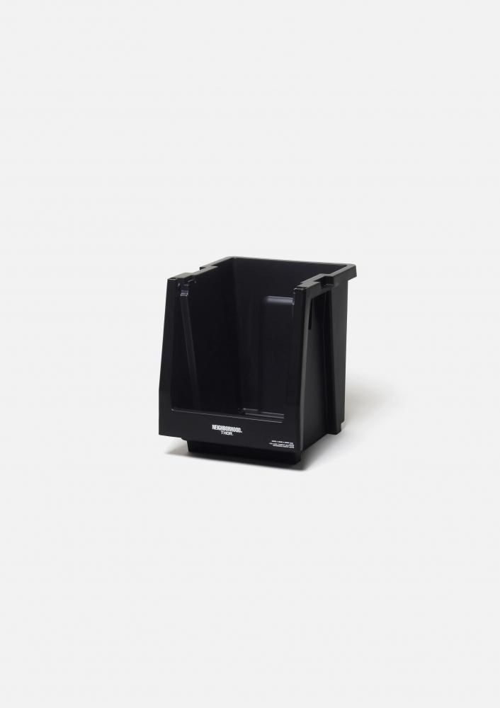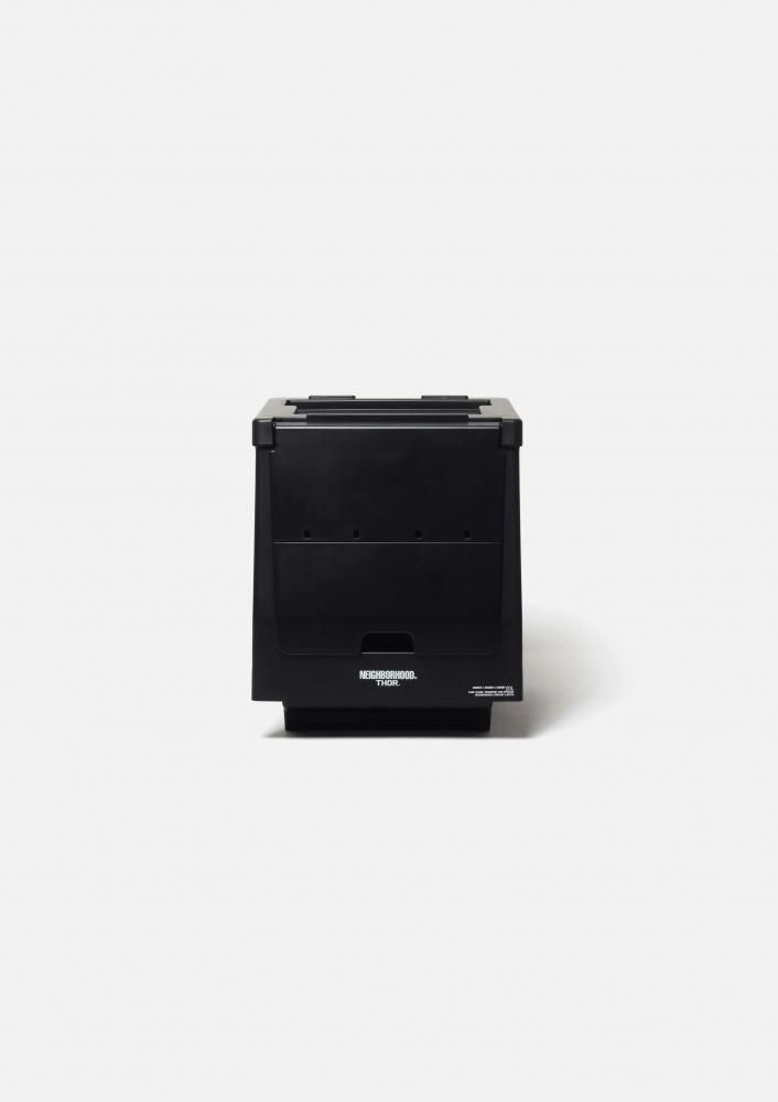 本体・蓋・扉を用途に応じて自由に組み合わせ可能なTHOR"スタッキングシェルフコンテナ"のジョイントワークアイテム。本体・蓋・扉をセットにした容量20Lモデル。両者のロゴをプリント。ポリプロピレン製。