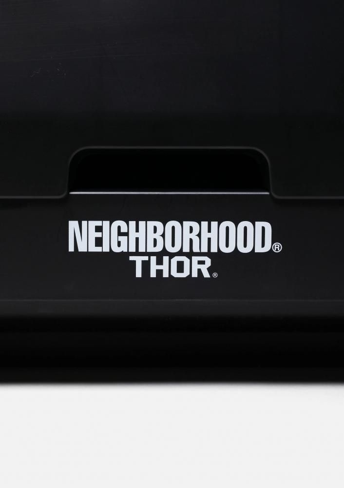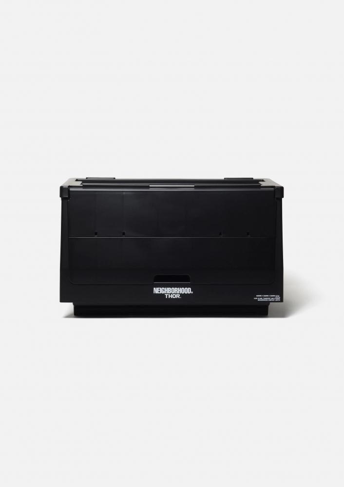 本体・蓋・扉を用途に応じて自由に組み合わせ可能なTHOR"スタッキングシェルフコンテナ"のジョイントワークアイテム。本体・蓋・扉をセットにした容量50Lモデル。両者のロゴをプリント。ポリプロピレン製。