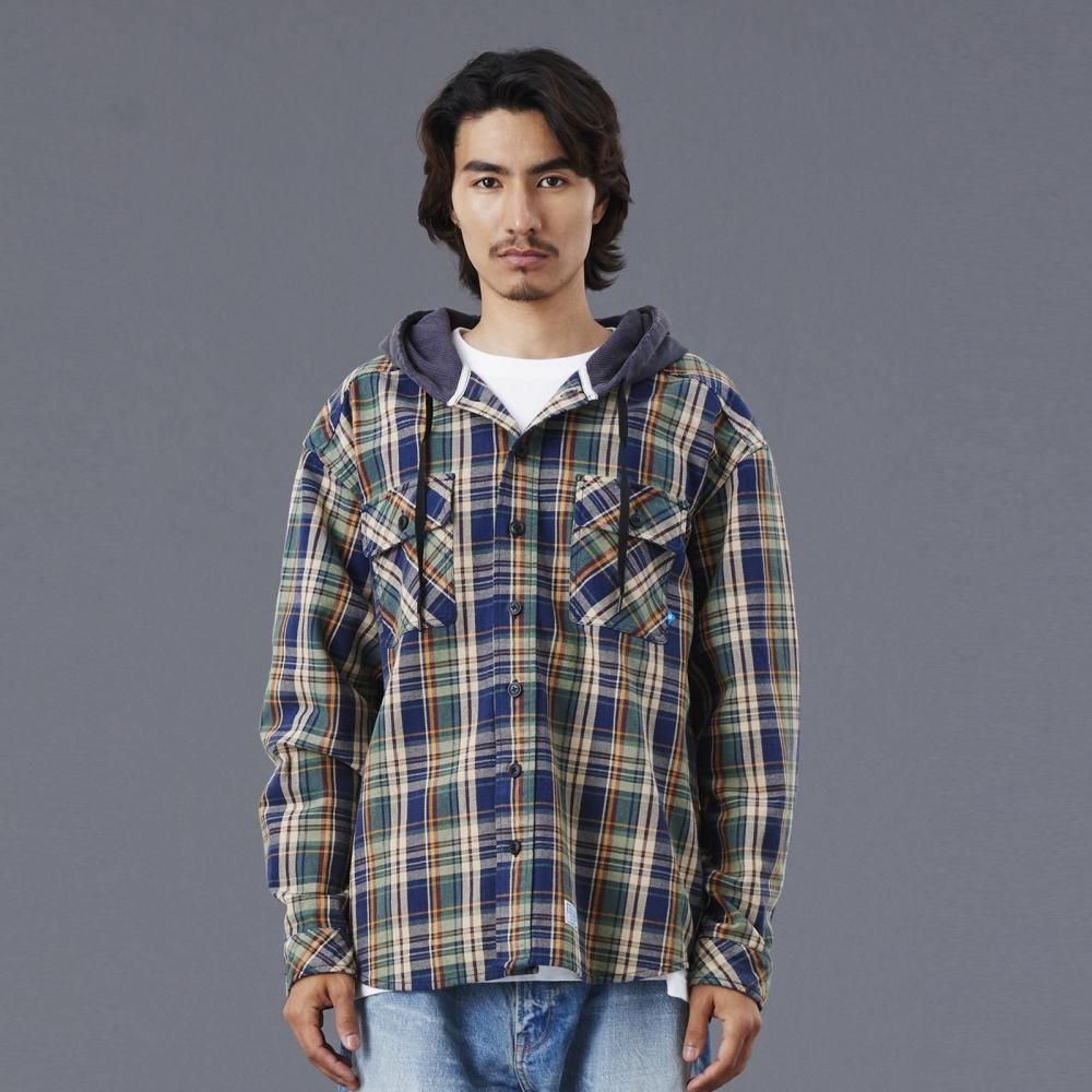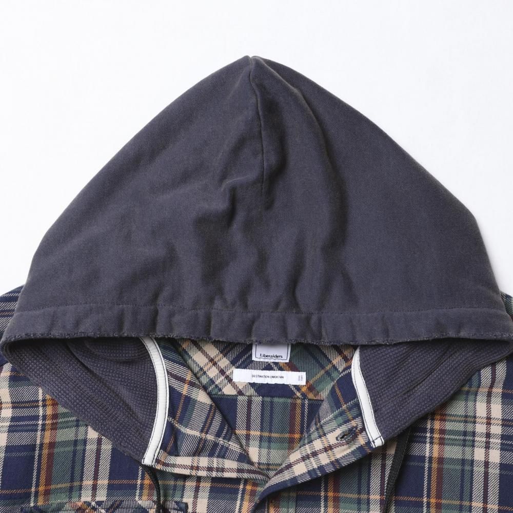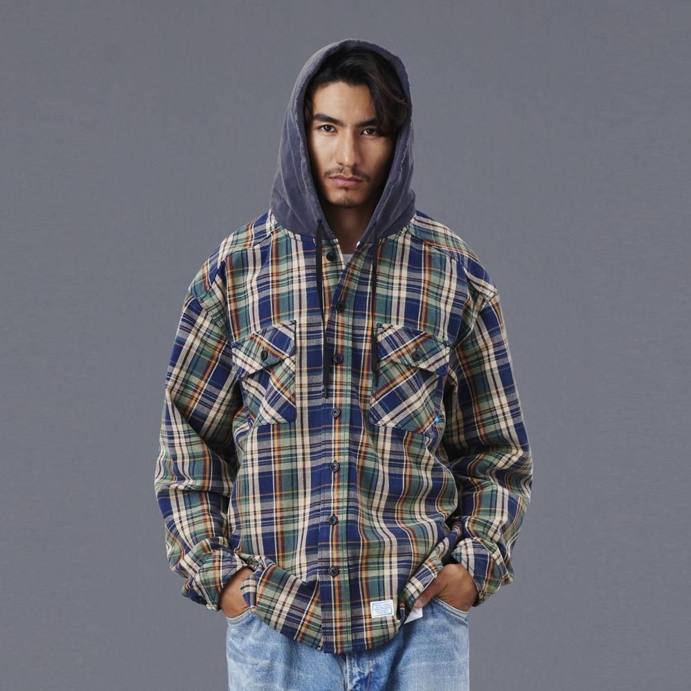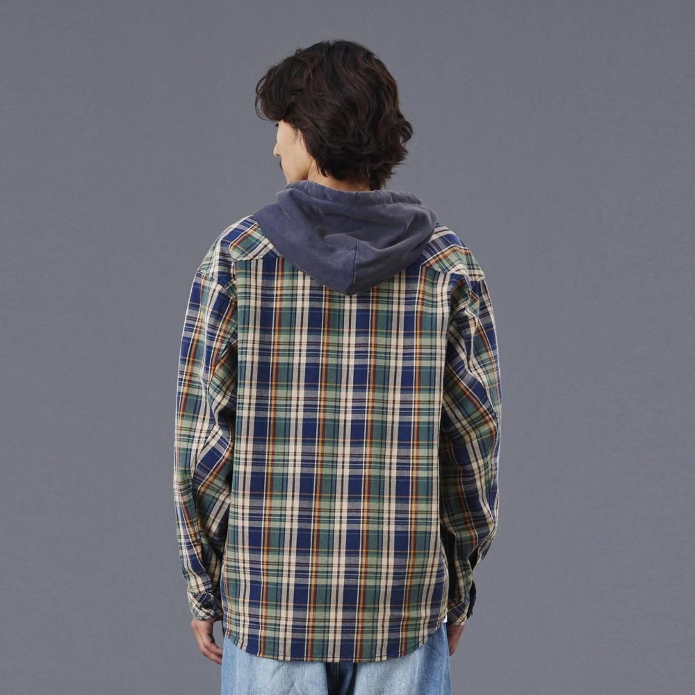 地厚なヘビーネルを使用し、フーディとのレイヤード風に裏毛のフードをドッキングしたシャツ。