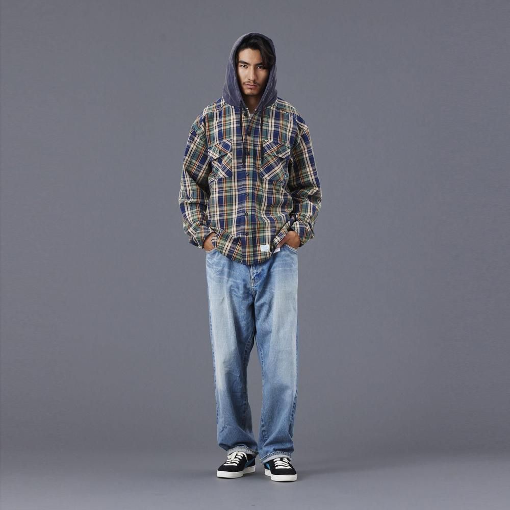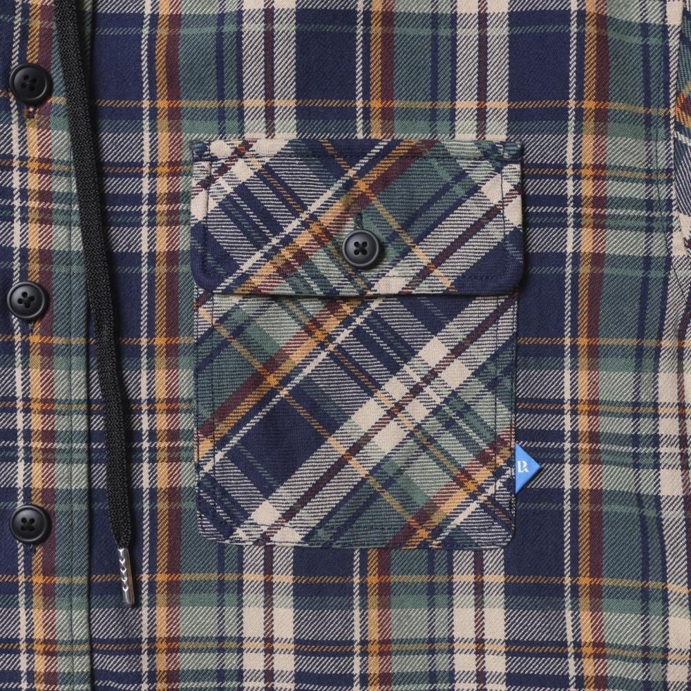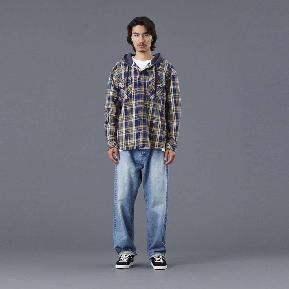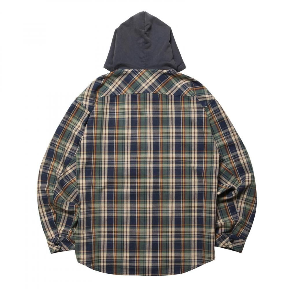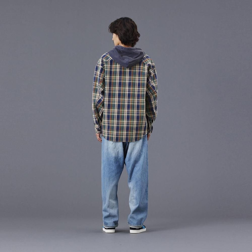 地厚なヘビーネルを使用し、フーディとのレイヤード風に裏毛のフードをドッキングしたシャツ。