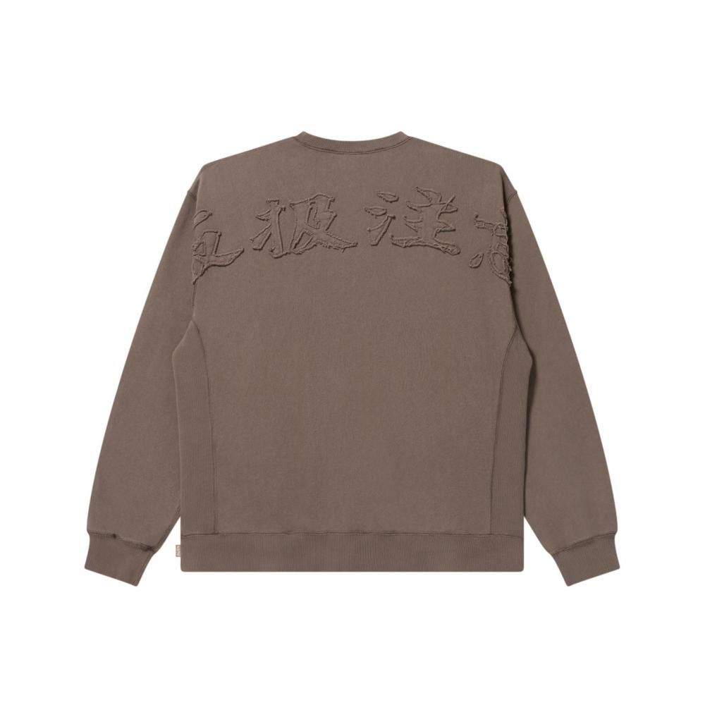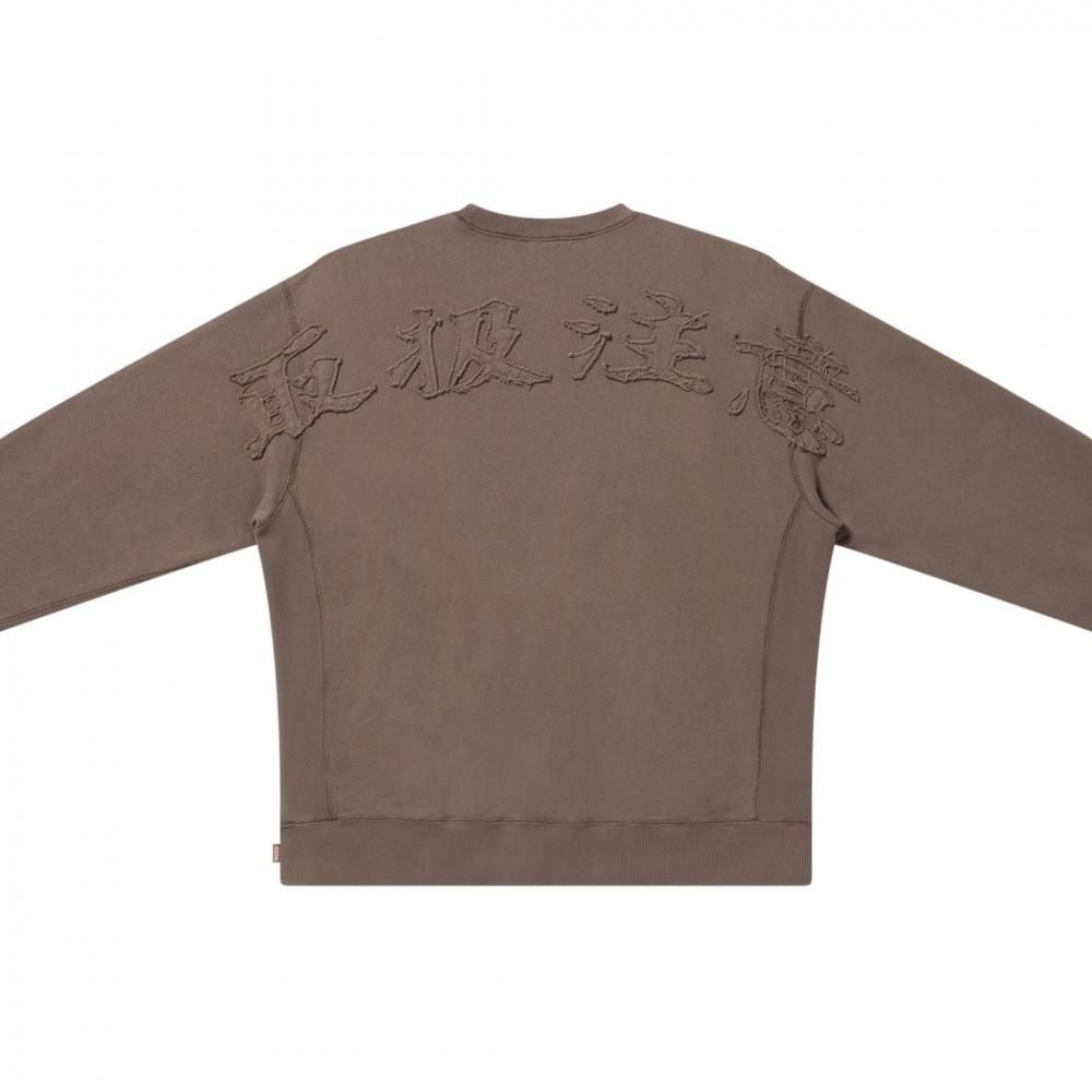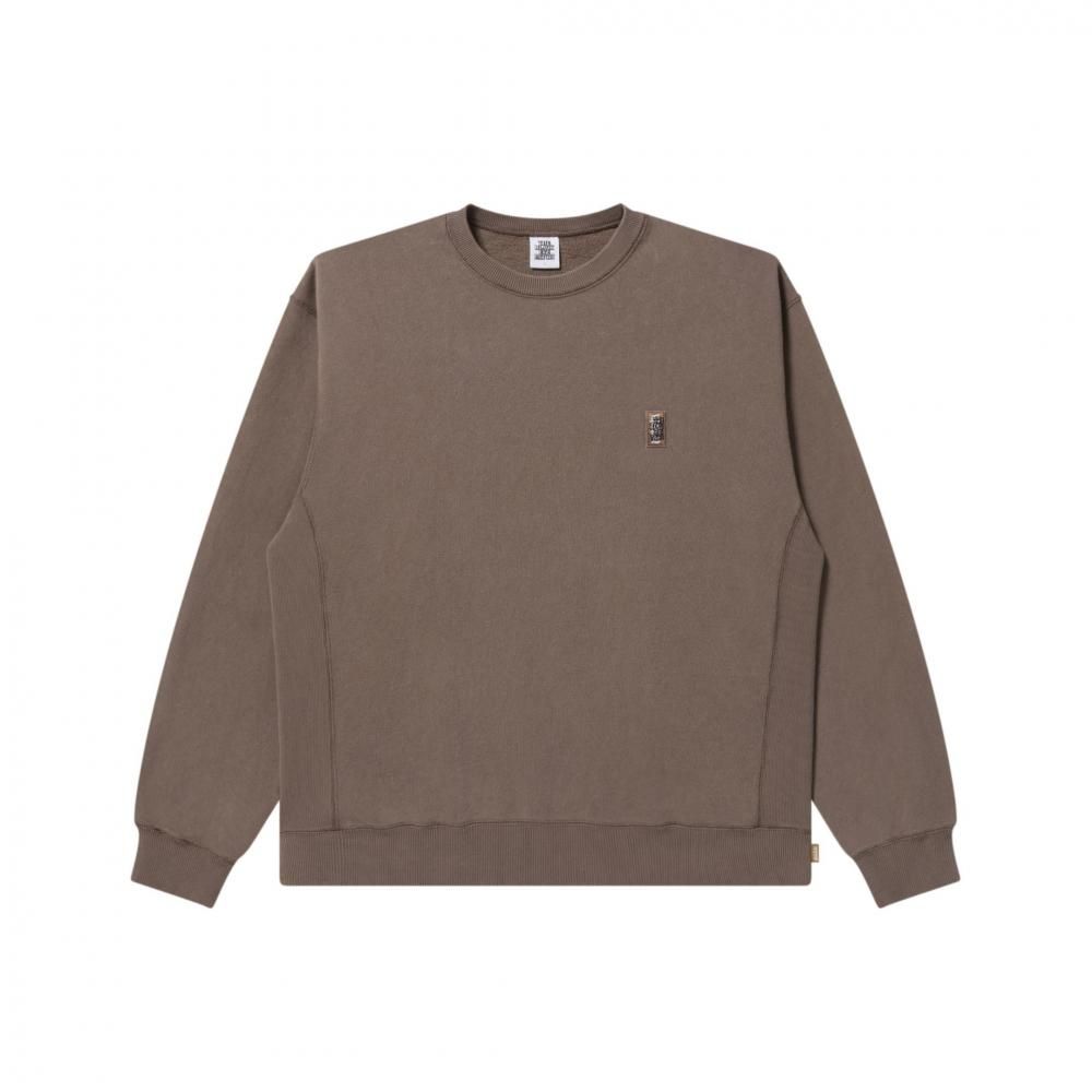 ピグメント加工されたボディと同生地の "取扱注意" のアップリケが背中に、ボディと同系色の刺繍ワッペンが左胸に配置されたクルーネックスウェット。