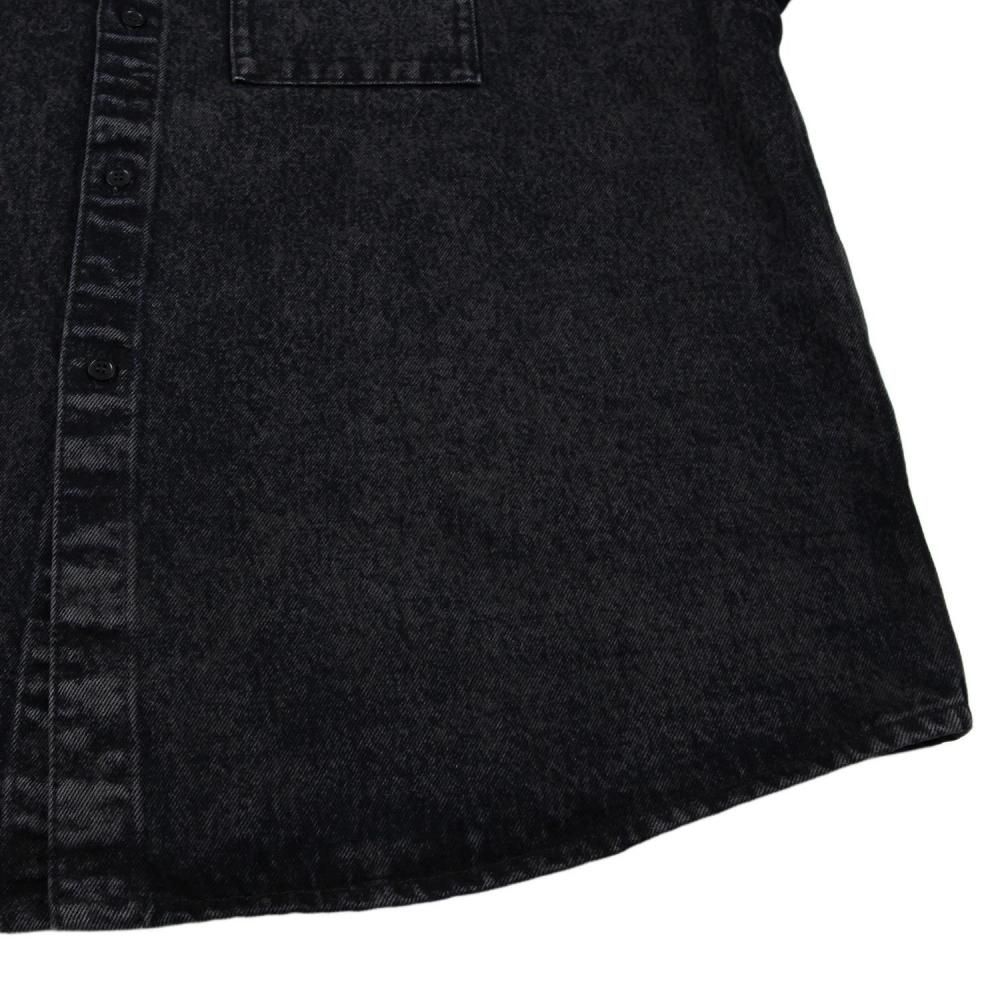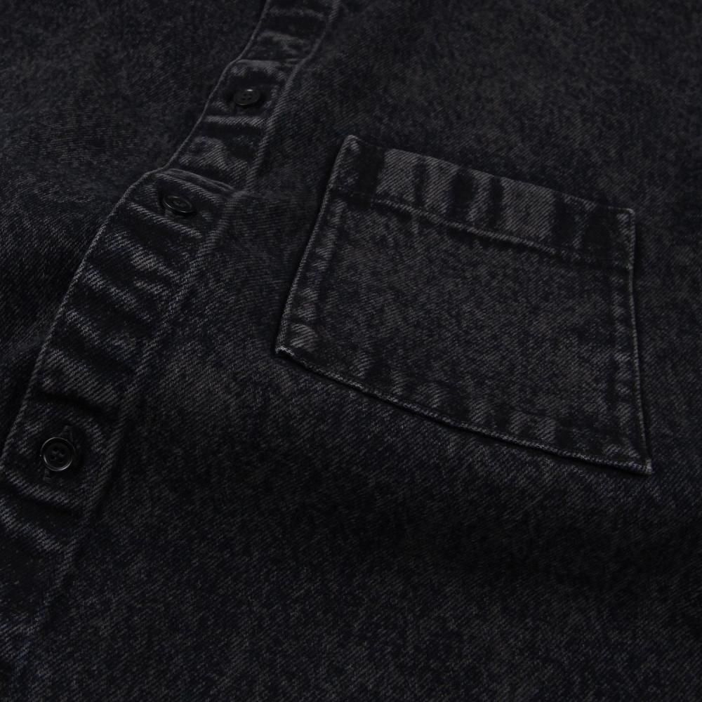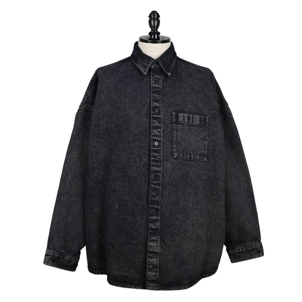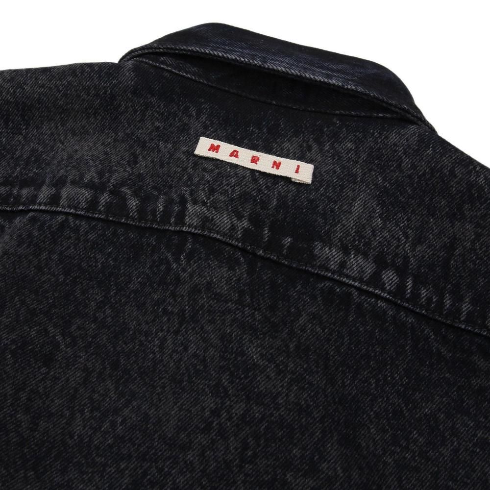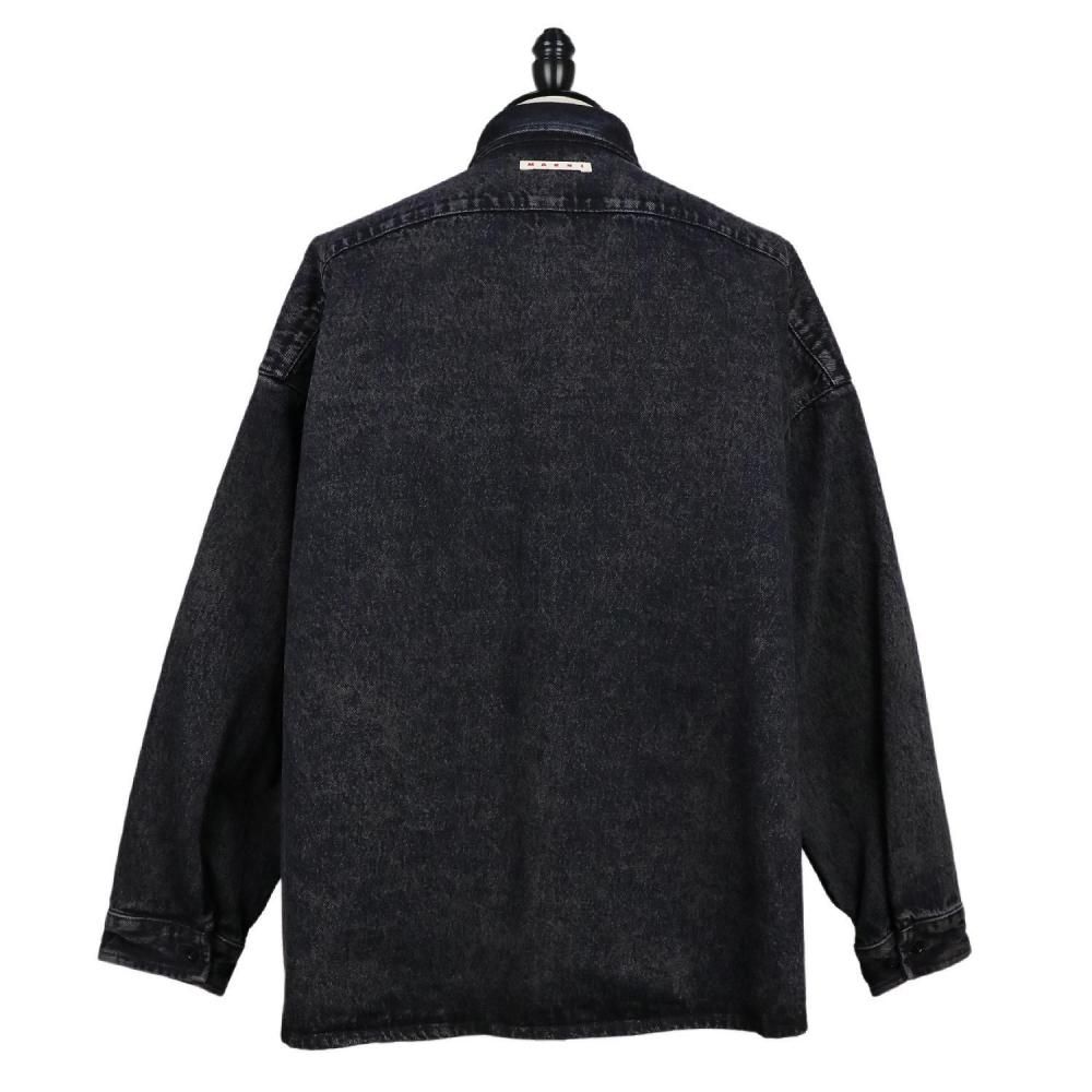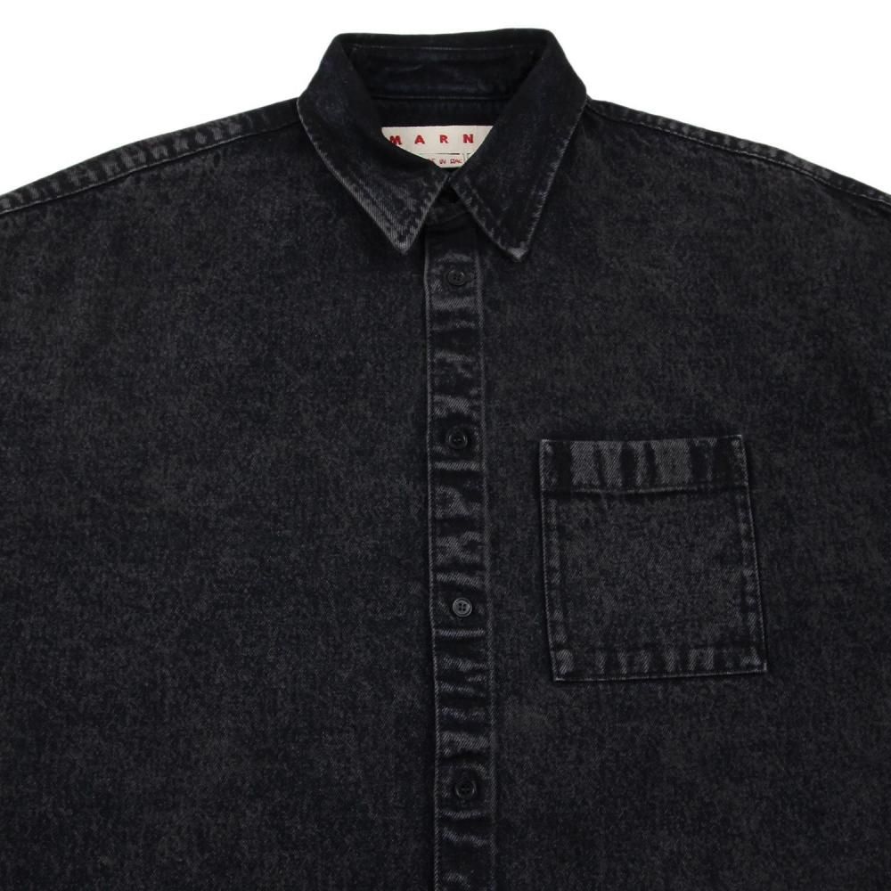 マーブルダイウォッシュ加工を施したストレッチコットンデニムを使用したオーバーサイズの長袖シャツ。ストレートカット、カラー、フロントボタン開閉、胸ポケット。バックネックにマルニロゴのパッチ。 Made in Italy