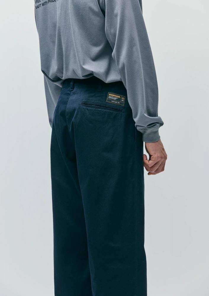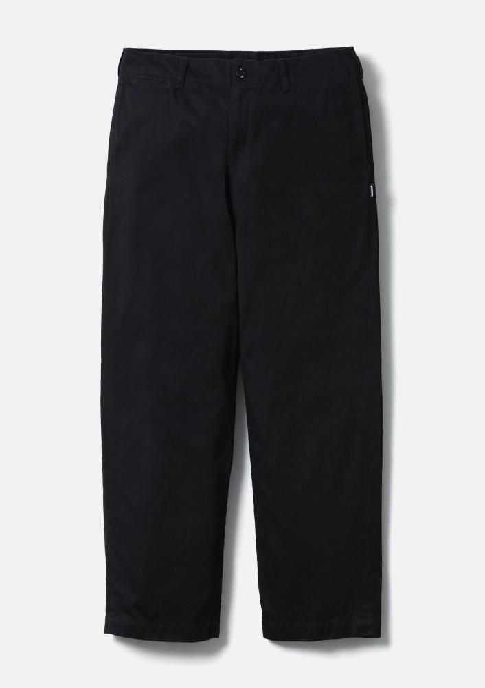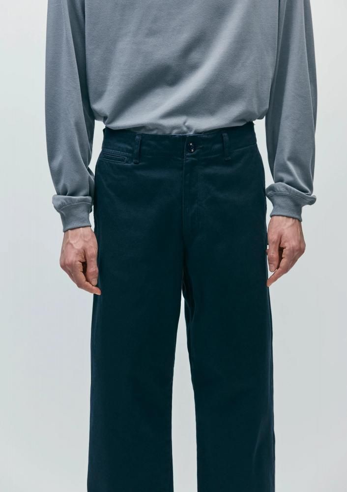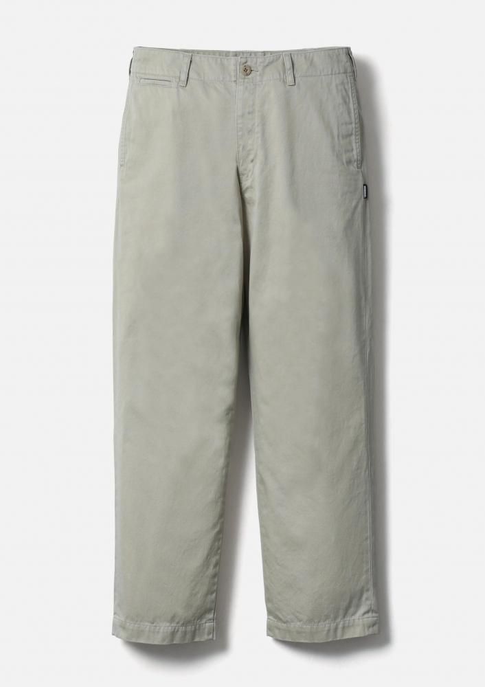 チノクロスの一種である高密度ウエストポイント生地を使用し、バイオストーンウォッシュ加工を施したチノパンツ。通常のチノとは異なり2本の糸で織り上げるため、よりタフで光沢感のある仕上がりが特徴。オリジナルの4つ穴ボタンとフロントファスナーを採用。ヒップポケット上部にネームタグ、サイドシームにピスネームを付属。ゆとりのあるストレートシルエット。