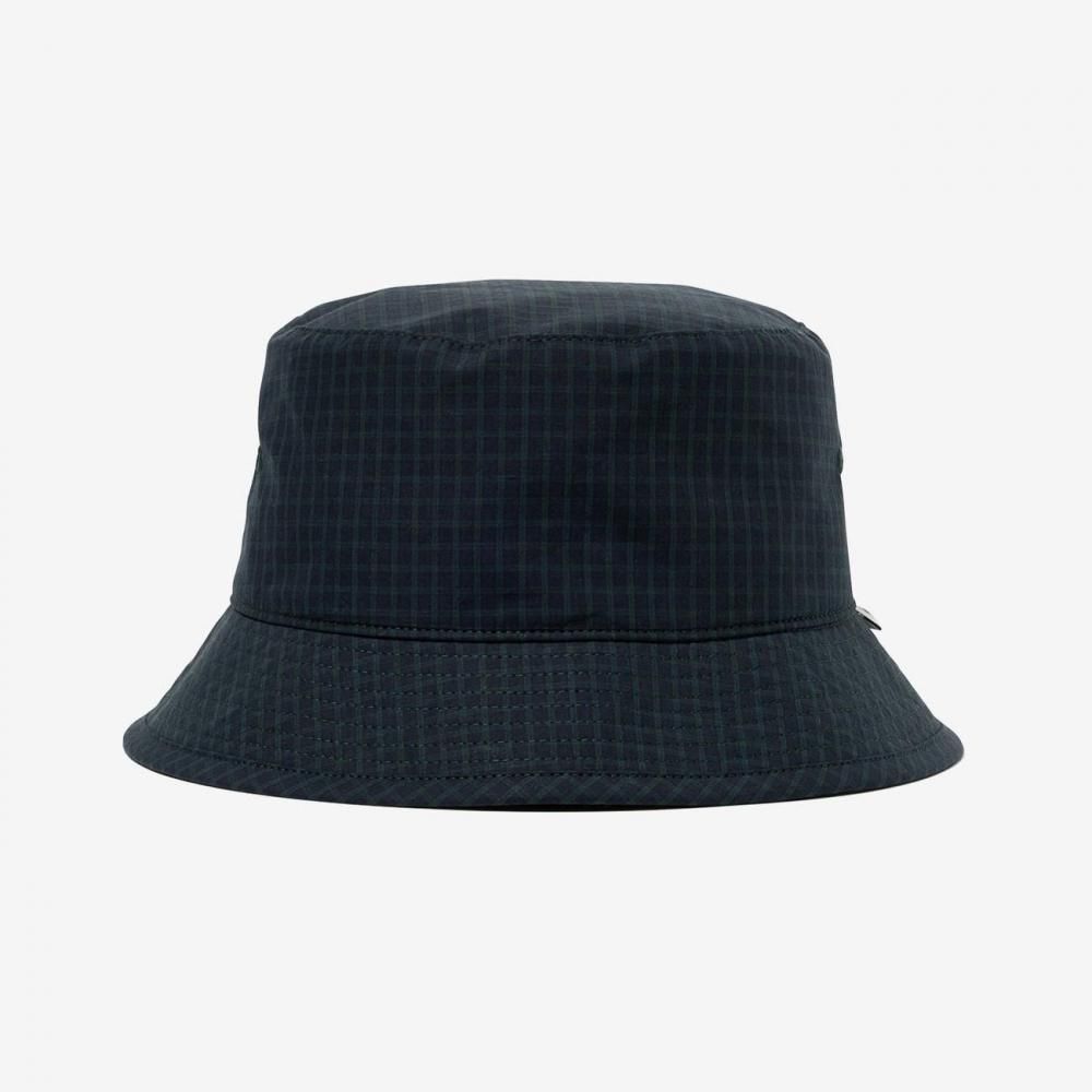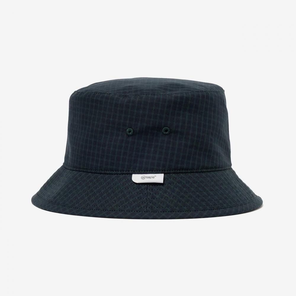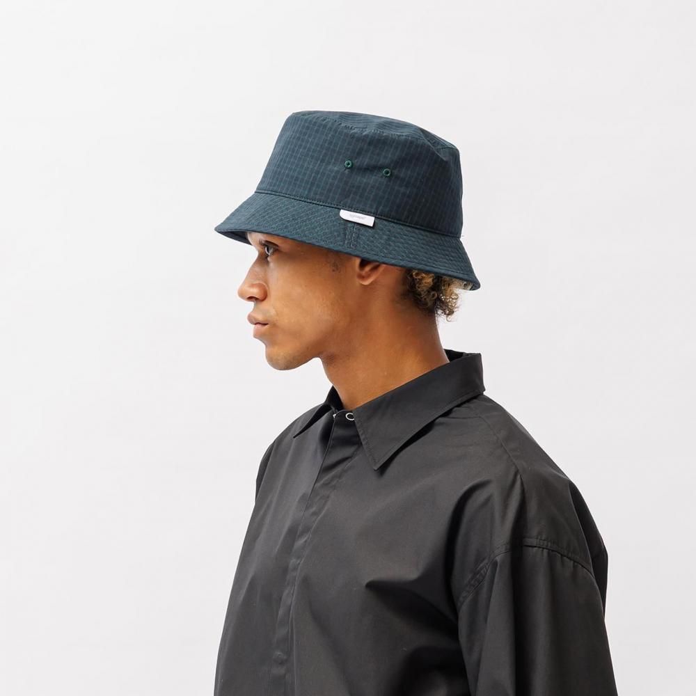 オリジナルブラックウォッチのタイプライター生地を使用したバケットハット。バックに刺繍モチーフ、両サイドパネルに穴かがり、左サイドにピスネームを配置。