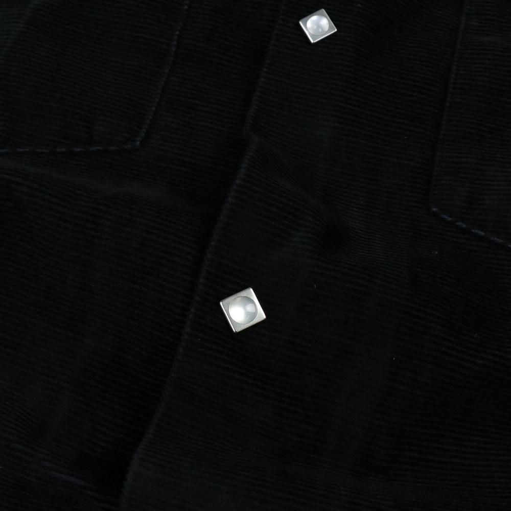 フロント、カフ、ポケットのボタンはパール風スナップボタン、第一ボタンのみルーパー留め仕様。