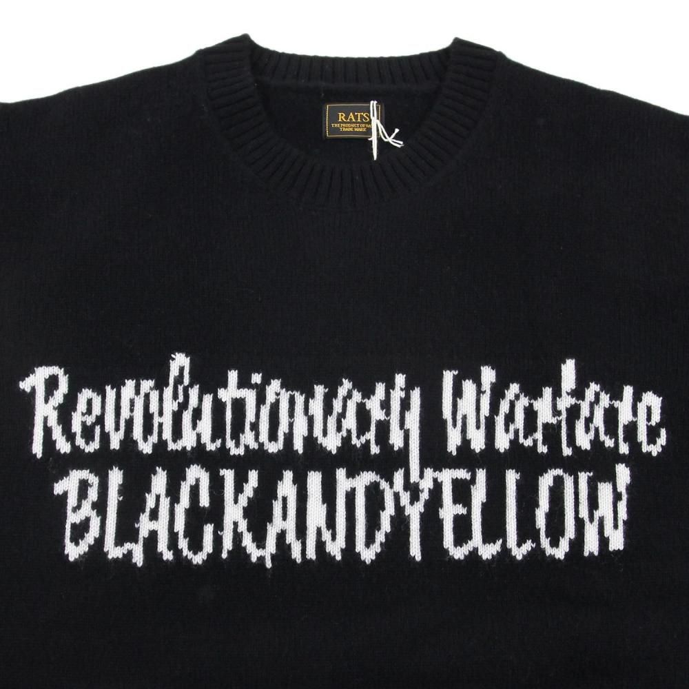 カシミヤ30%の極上の質感を有する、ウール/カシミヤの混紡糸を使用したクルーネックニット。フロントにREVOLUTIONARY WARFARE・BLACK AND YELLOWロゴをジャガードで表現したデザイン。襟・袖・裾に編み地の異なるリブを組み合わせた手の込んだ仕立てとなっている。レギュラーフィットシルエット