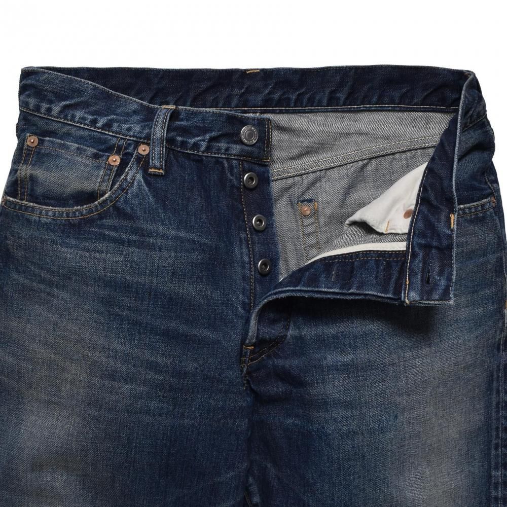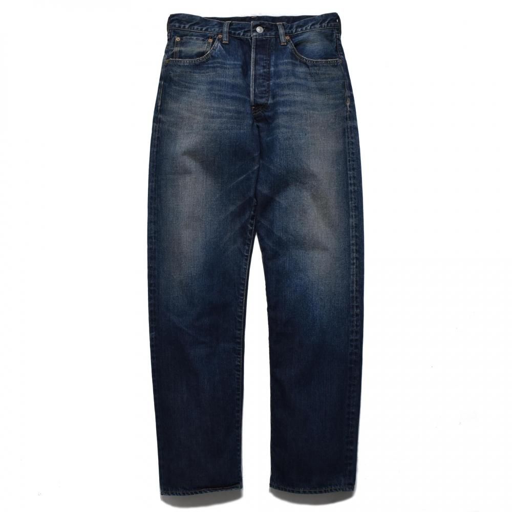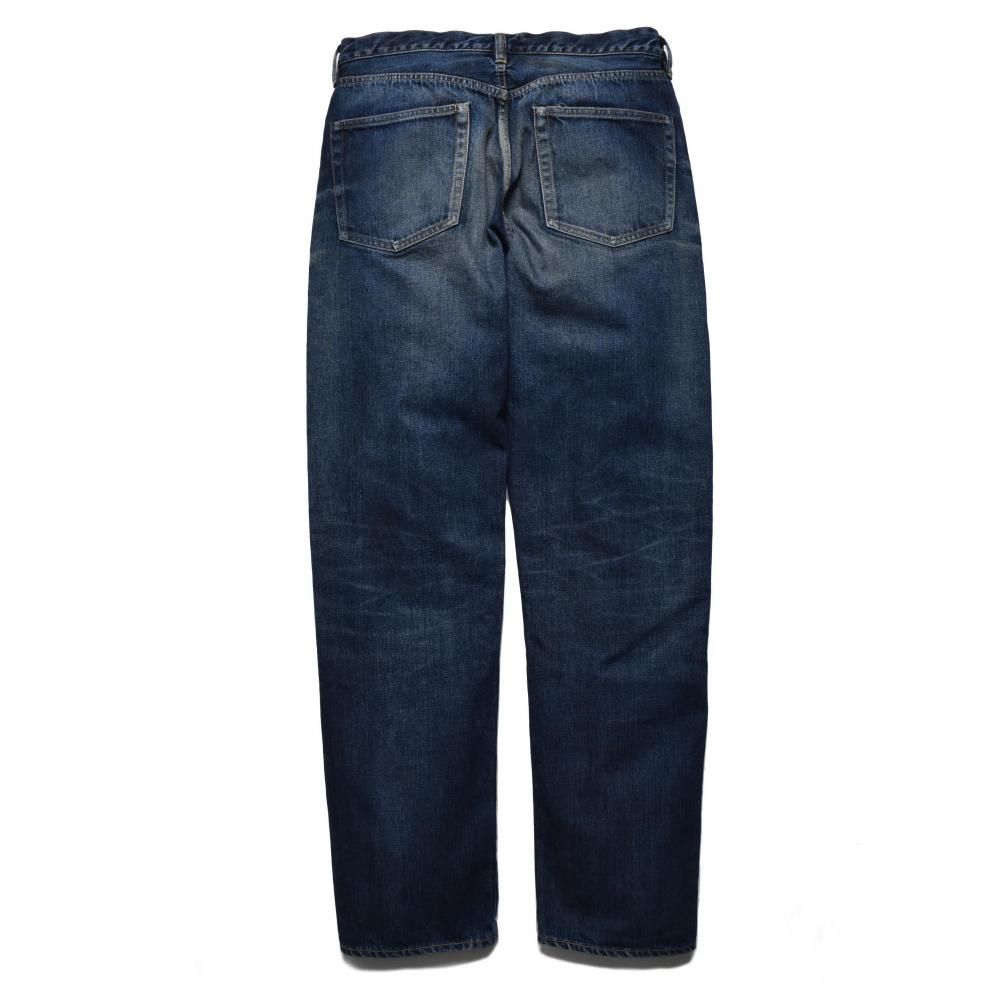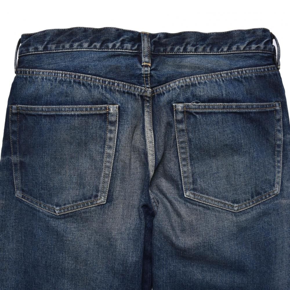 やや濃色に残したベースウォッシュとリアルな表情のUSED加工を施したルーズストレート5ポケットジーンズ。