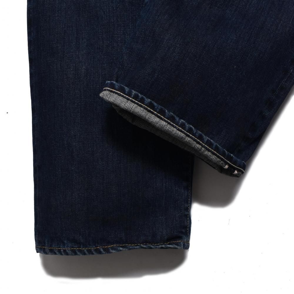 13.5ozのオリジナルインディゴセルヴィッジデニムにシルケット加工を追加する事でムラ感を抑えつつヴィンテージライクな表情に仕上げたデニムを採用。