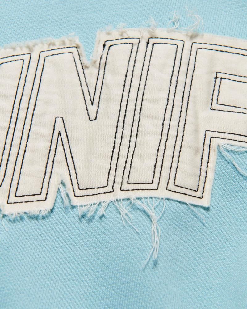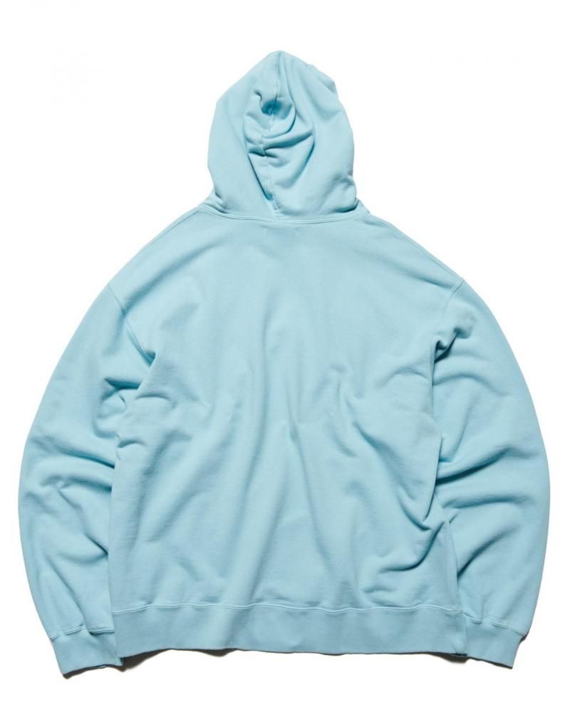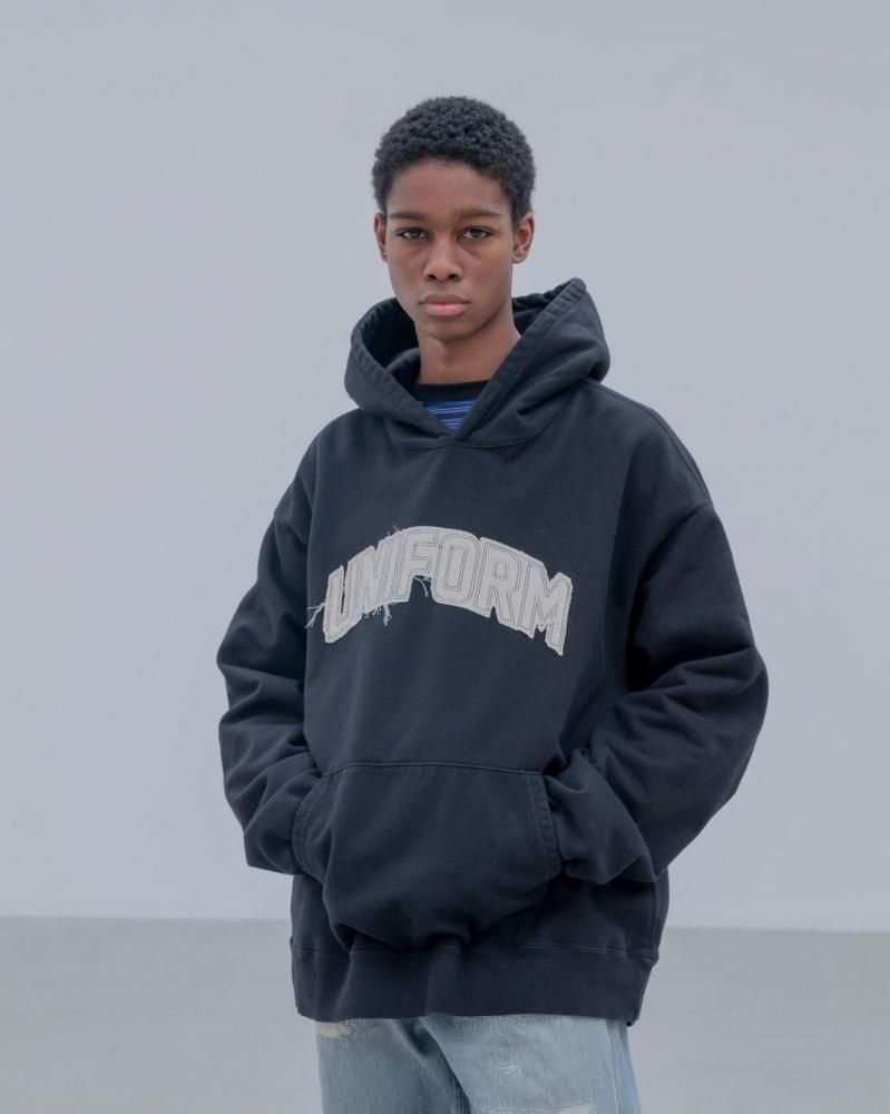 フェード加工によって適度な色落ち感を出したパイル編みのコットンボディに、断ち切りのシーチング生地でアーチロゴをパッチワークしたスウェットフーディー。クルーネックスウェット、Tシャツ、ストライプシャツとともに、手作業のようなラフさをあえて残すことで今季のテーマ “UNFINISHED”に沿ったイメージを表現しています。ゆとりを持たせたリラックスフィットに仕上げているため、中にシャツを挟むなど多様な着こなしが可能です。