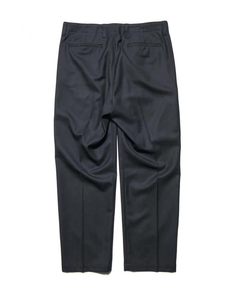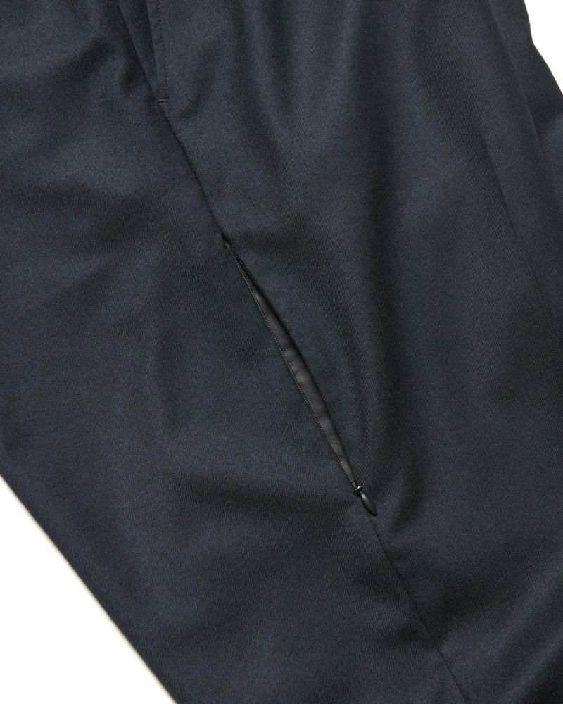 ウール50%・ポリエステル50%の混紡糸を用いた、ストレッチ性の高いサキソニー素材のテーパードパンツ。両サイドに視認性の低いコンシールファスナーポケットを配備したソリッドなデザインは幅広いトップスにフィットします