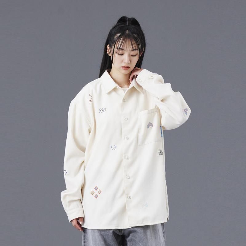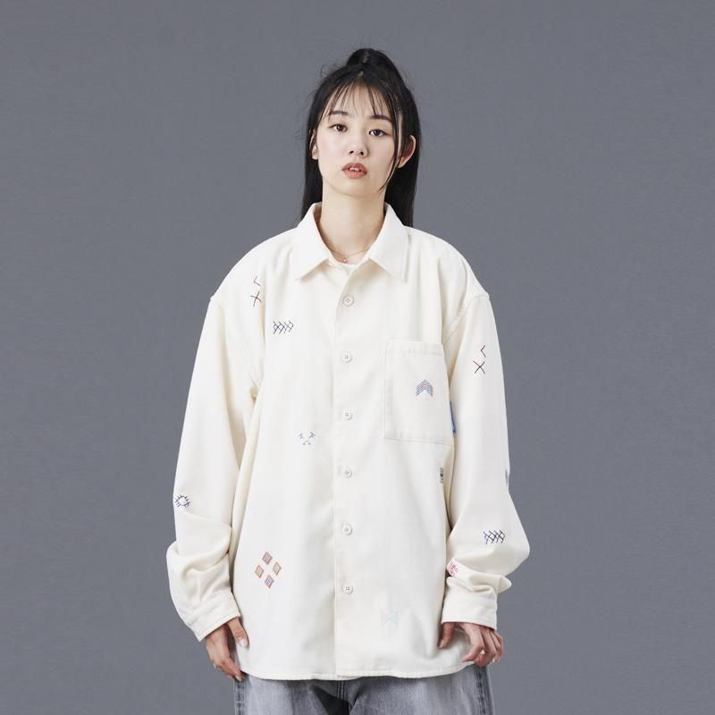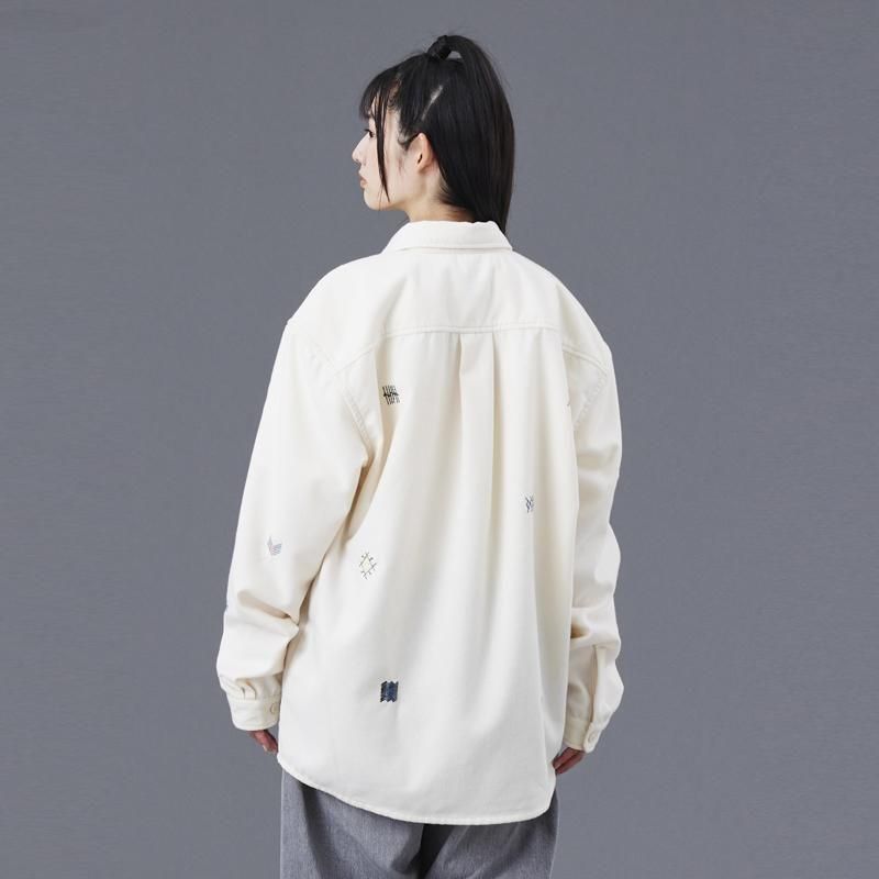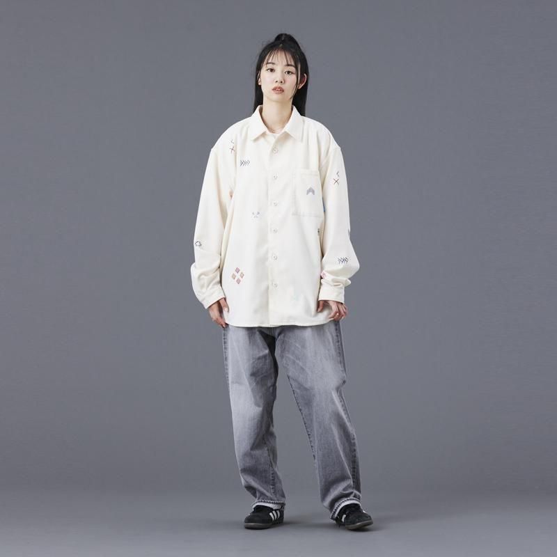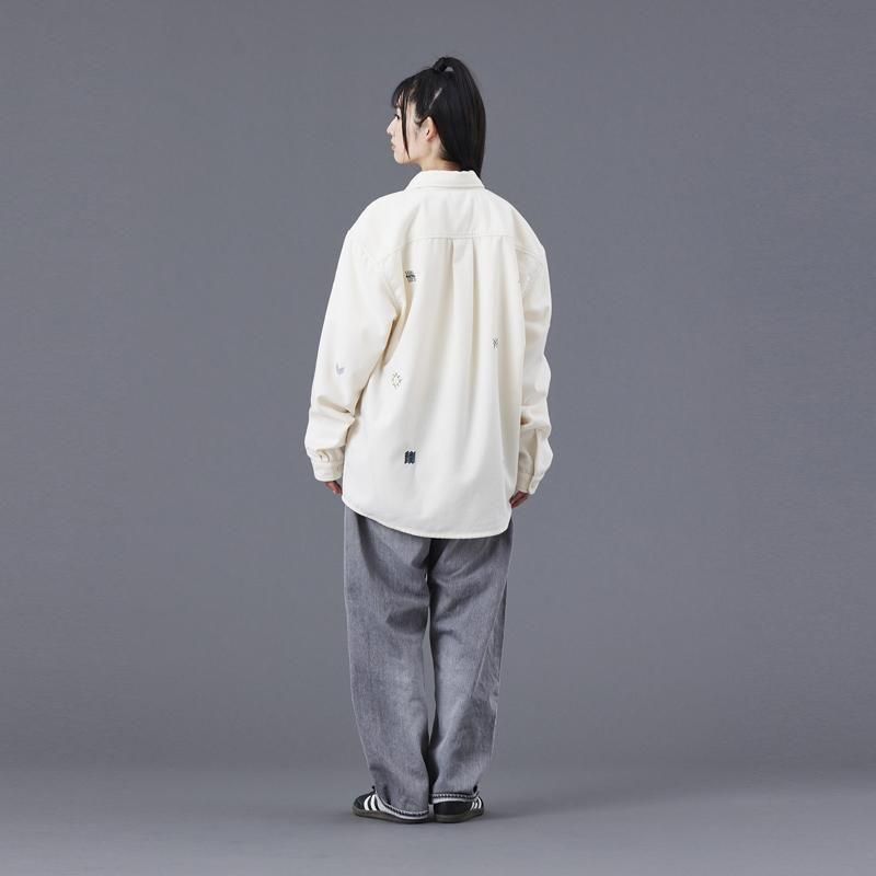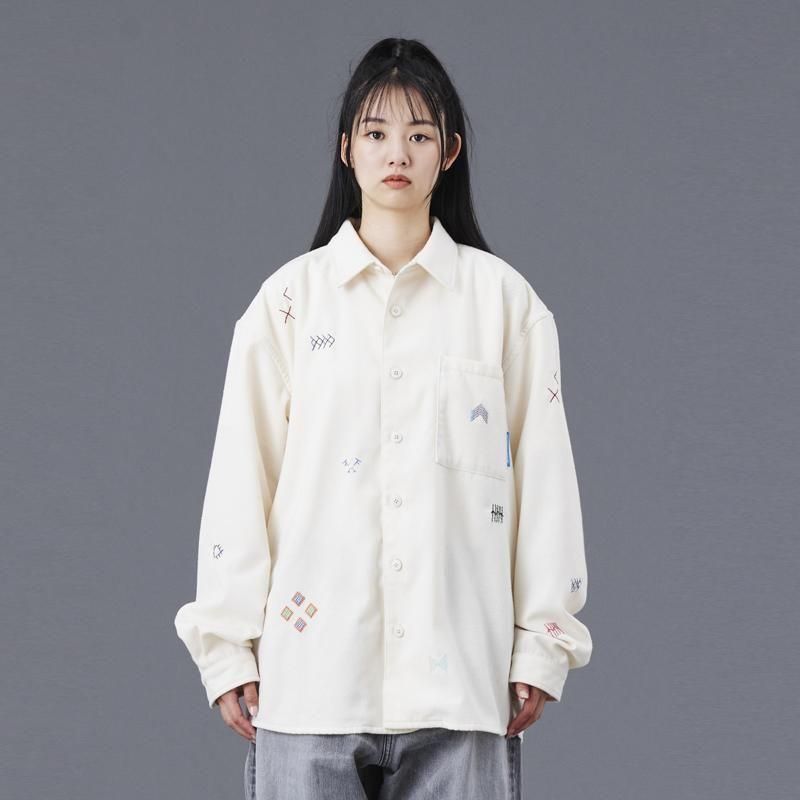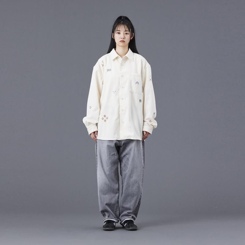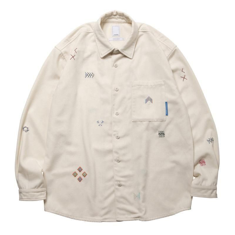 地厚なフランネル生地にモロッコの少数民族が使用しているティファナグ文字(象形文字)がハンド風刺繍で入ったシャツ。ゆったりしたシルエットで着やすい一着。