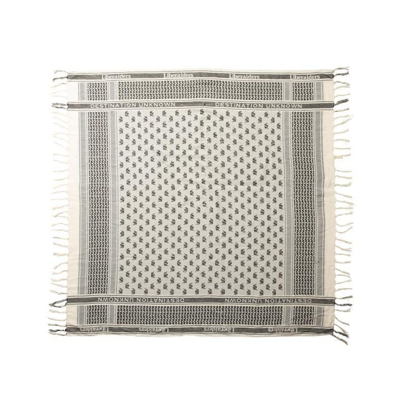 Liberaiders は 1.2m 四方)OG ロゴと DESTINATION UNKNOWN のロゴを配置中心部分には Liberaiders のアイコンである折り鶴を散りばめたこだわりの1枚首に巻く事はもちろん、頭から被って日除けに使うもよしの大活躍アイテム。