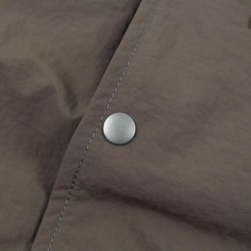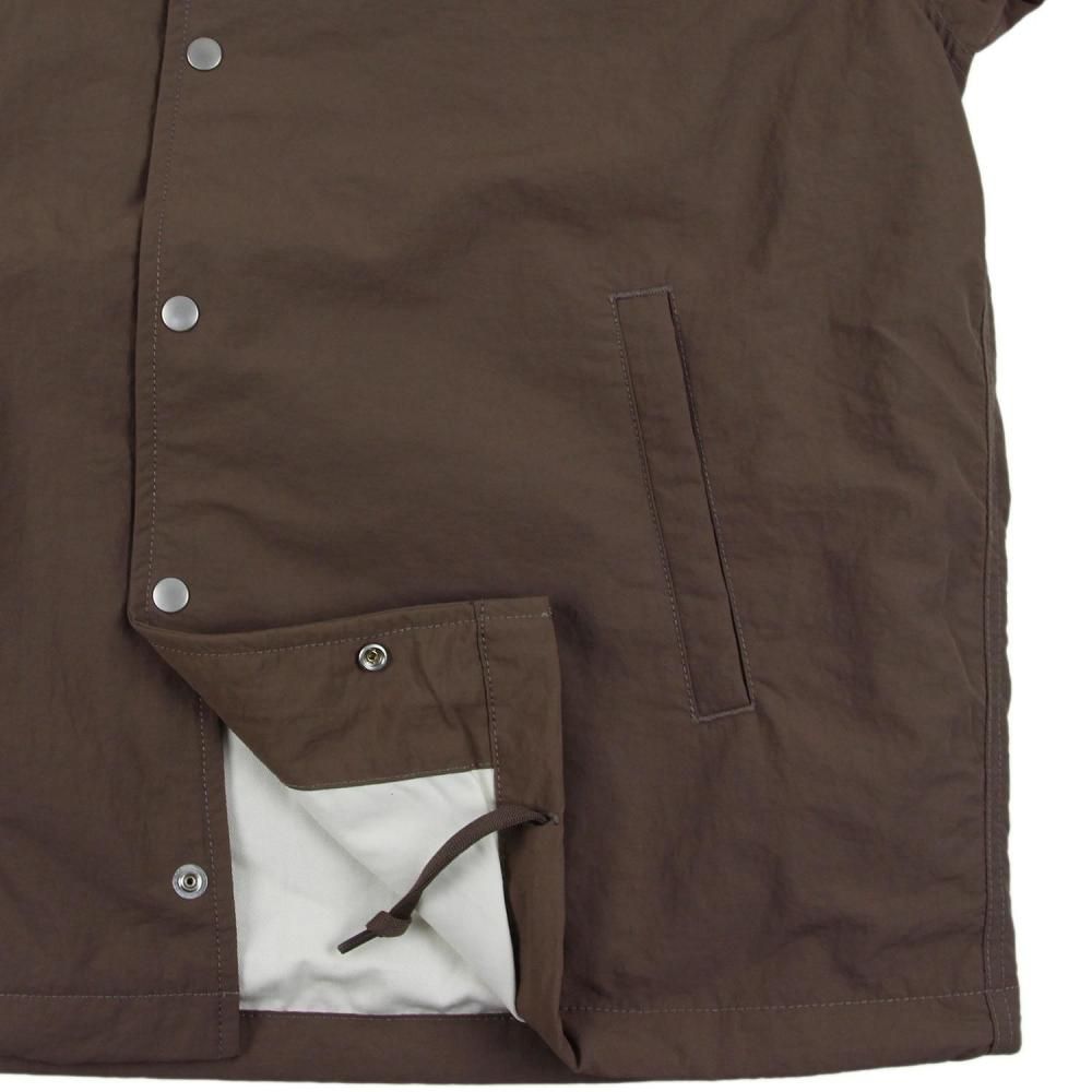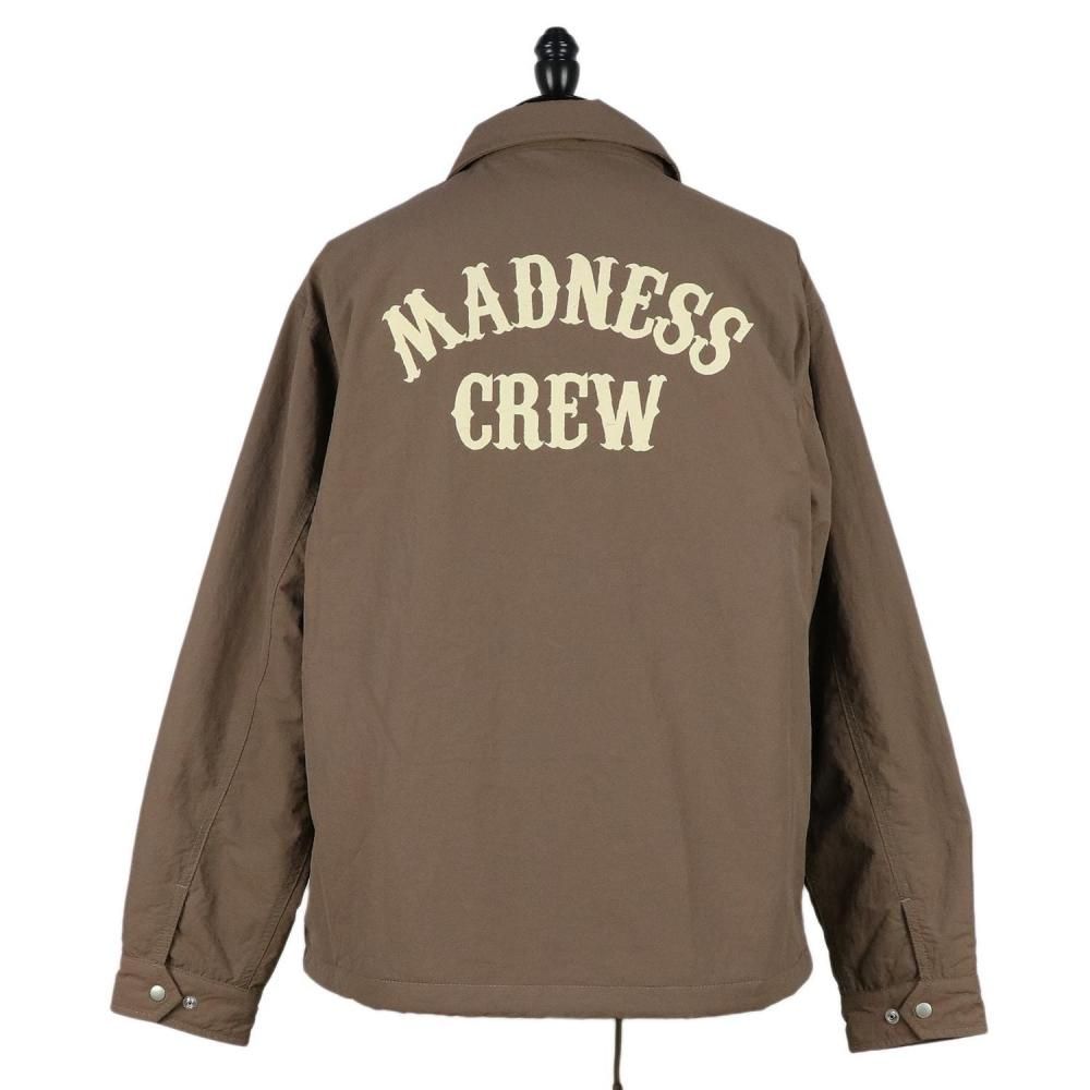 表地にナイロン、裏地にコットンを使用したコーチジャケット。ポリエステル中綿を使用した防寒性の高い仕様。両脇にスラッシュポケット、背面にMADNESS CREWのレターグラフィックをラバープリント、裾中央にスピンドルを付属。右ポケット縁にピスネームを叩きつけ。カフはヴィンテージのスポーツジャケットに見られるスナップボタン留めを採用。ドロップショルダー、身幅にゆとりのあるシルエット。中国製。