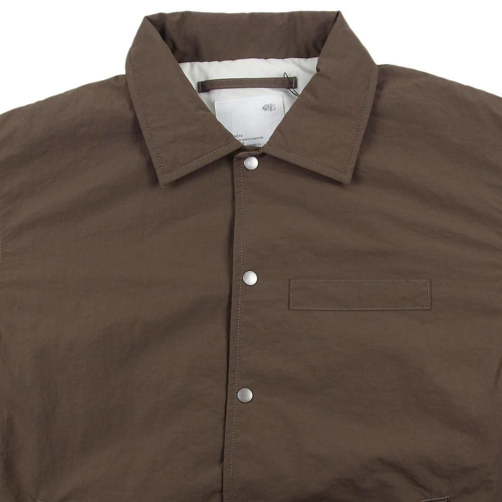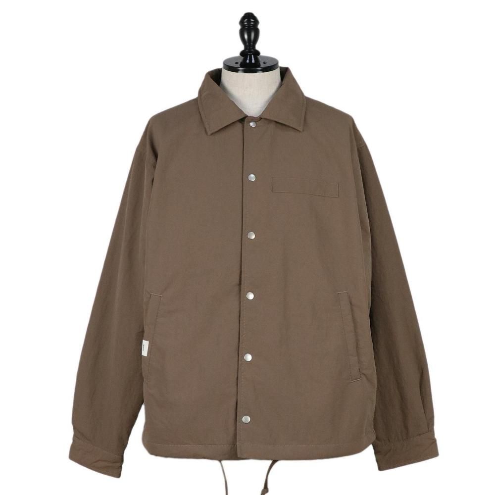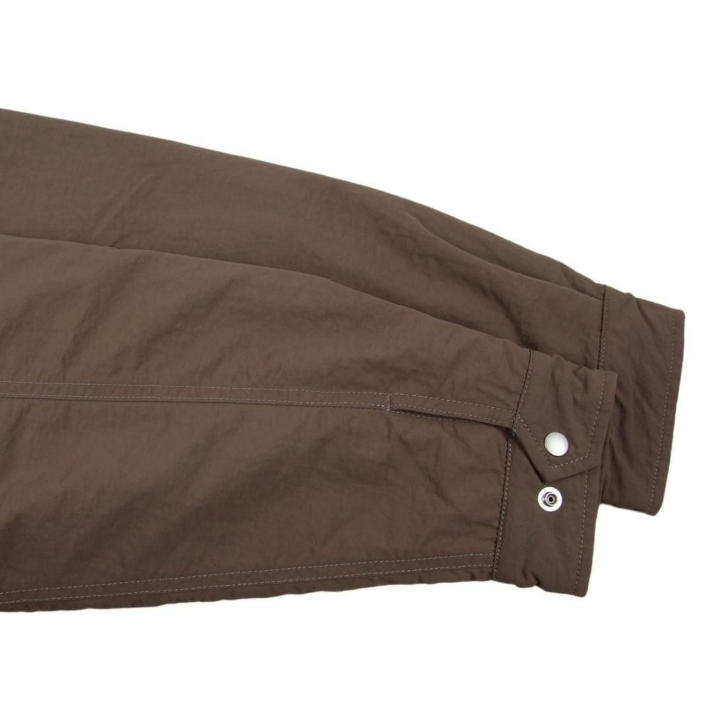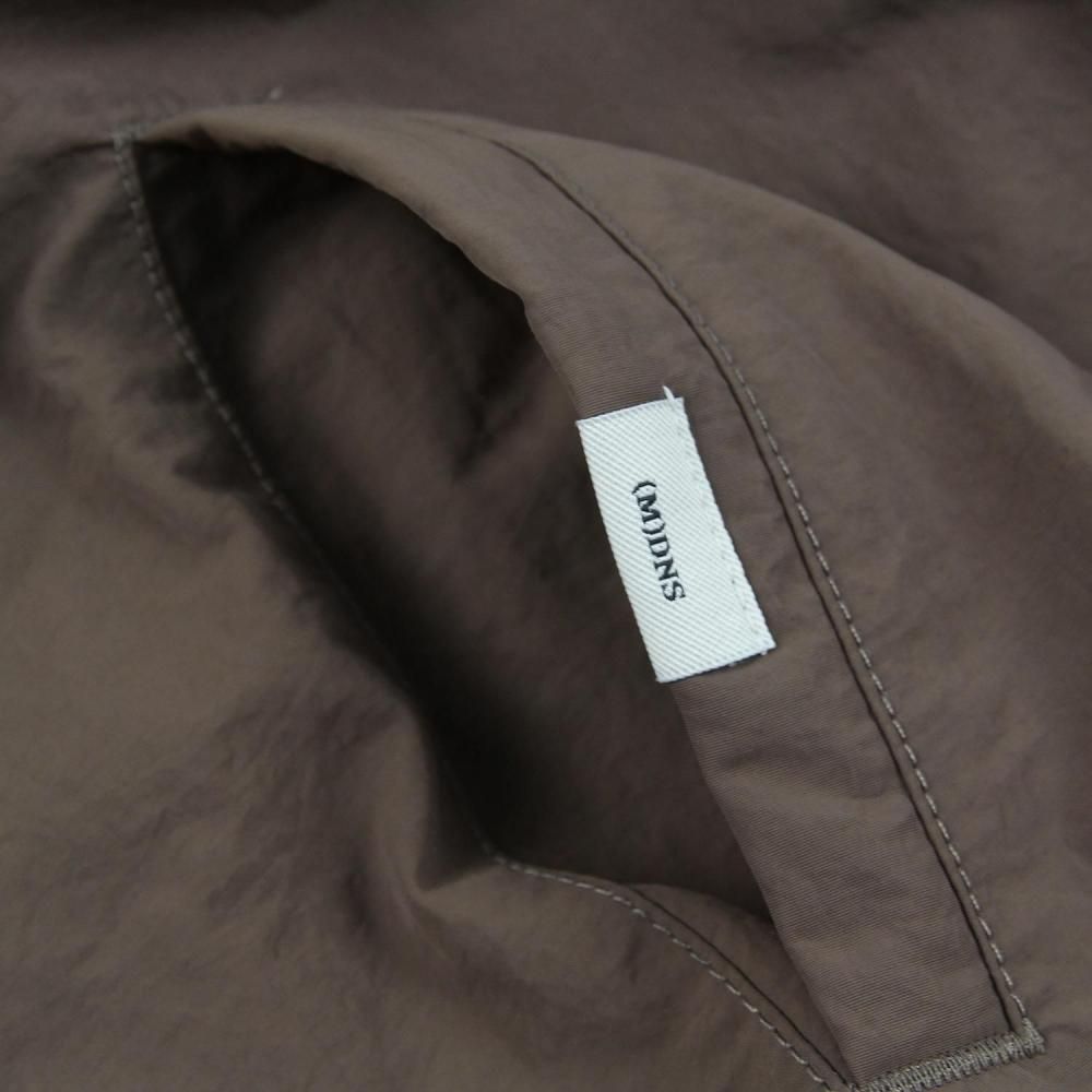 表地にナイロン、裏地にコットンを使用したコーチジャケット。ポリエステル中綿を使用した防寒性の高い仕様。両脇にスラッシュポケット、背面にMADNESS CREWのレターグラフィックをラバープリント、裾中央にスピンドルを付属。右ポケット縁にピスネームを叩きつけ。カフはヴィンテージのスポーツジャケットに見られるスナップボタン留めを採用。ドロップショルダー、身幅にゆとりのあるシルエット。中国製。