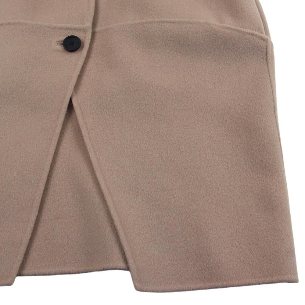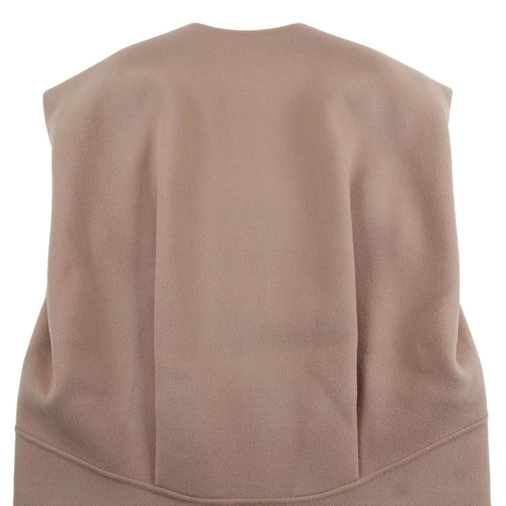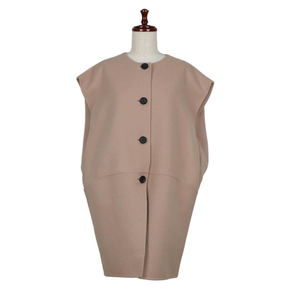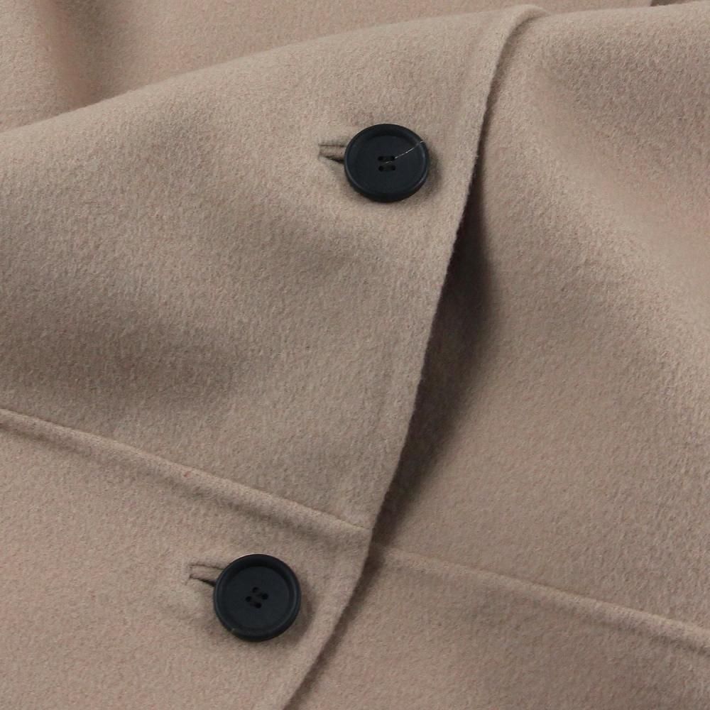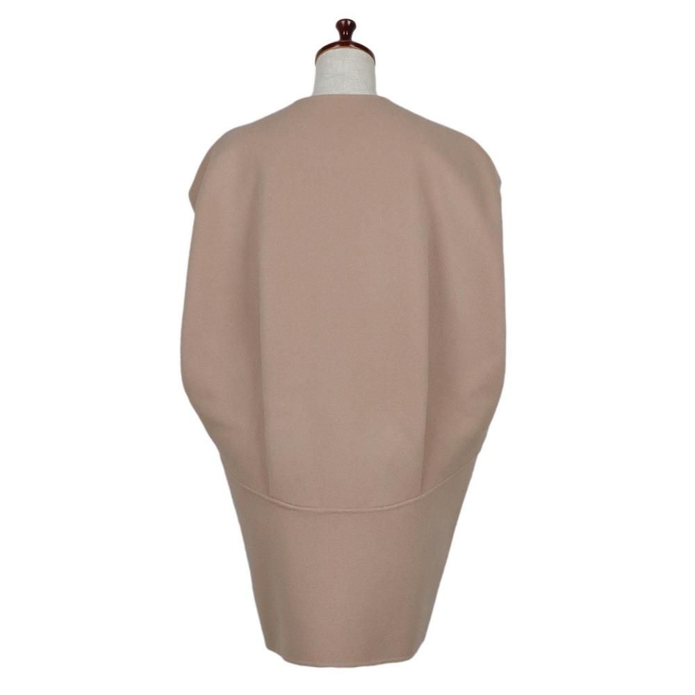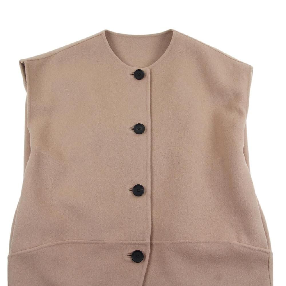 フロントは配色釦を効かせたシンプルなジレ、後ろはコクーン型にシルエットが出るよう切り替えやタックを駆使したデザイン。