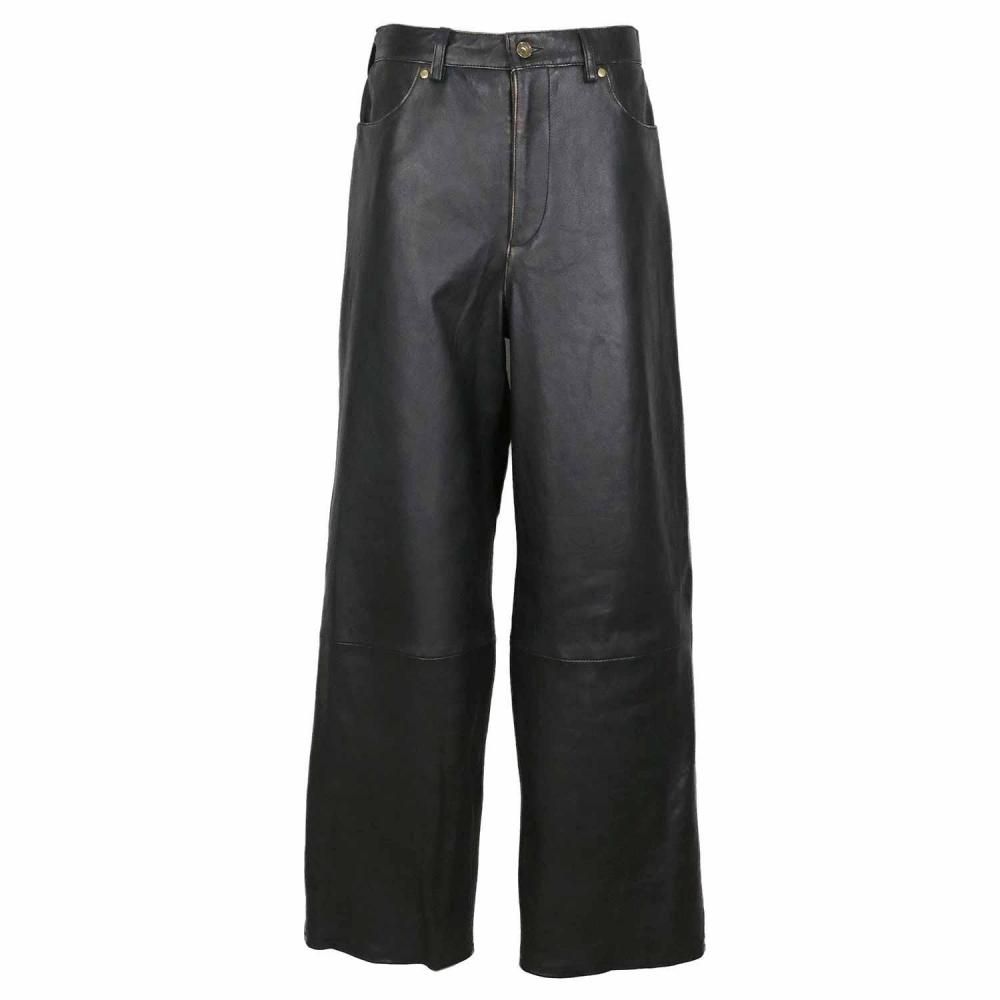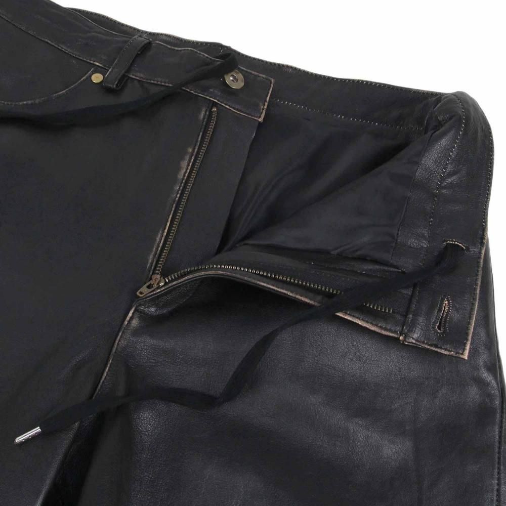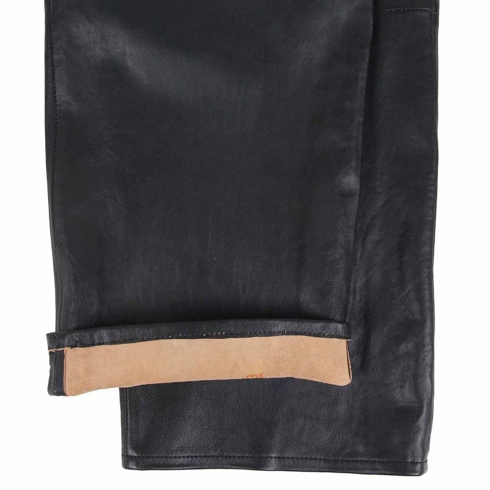 ウエストに対してワタリを広めに取り、ゆるくテーパードをかけたレザーパンツです。通常の5ポケットデザインに⽐べ、ゆったりとしたシルエットでリラッ