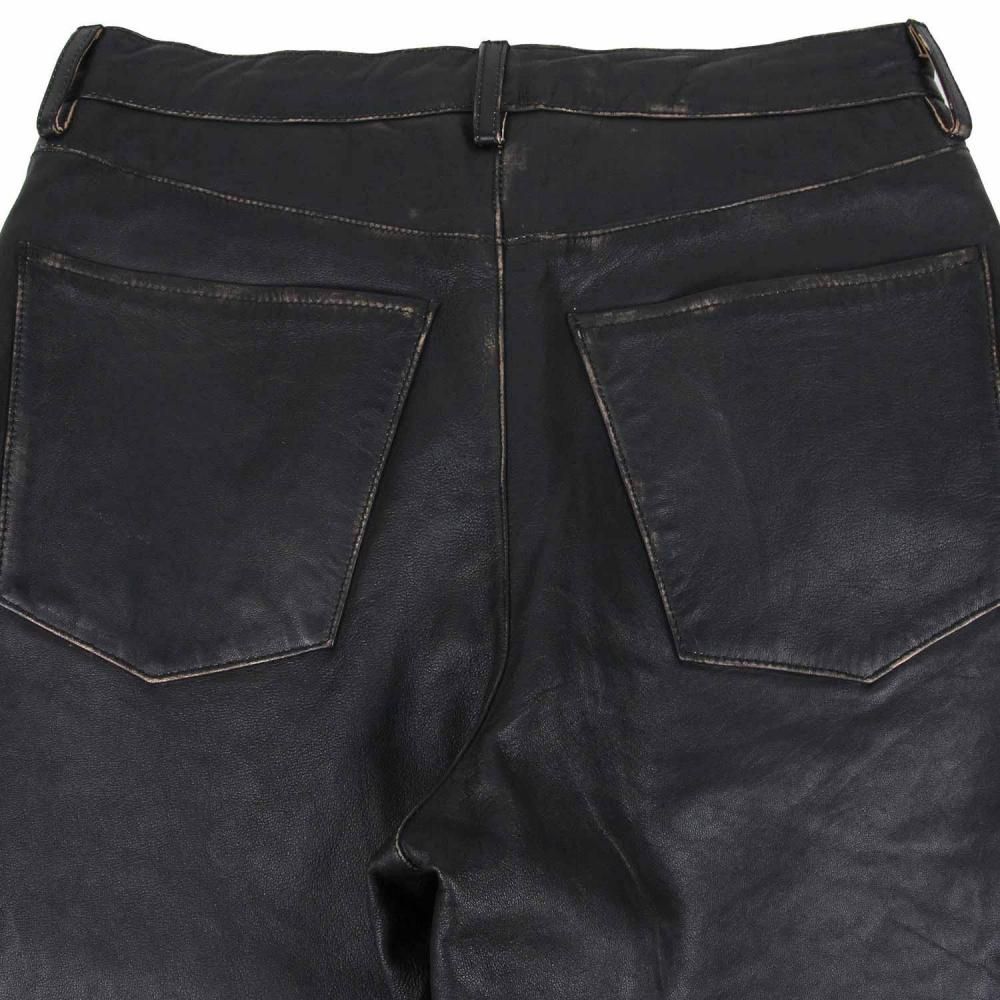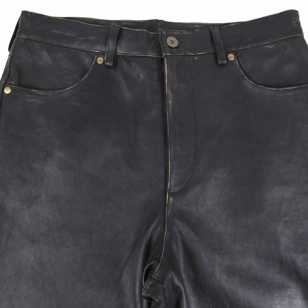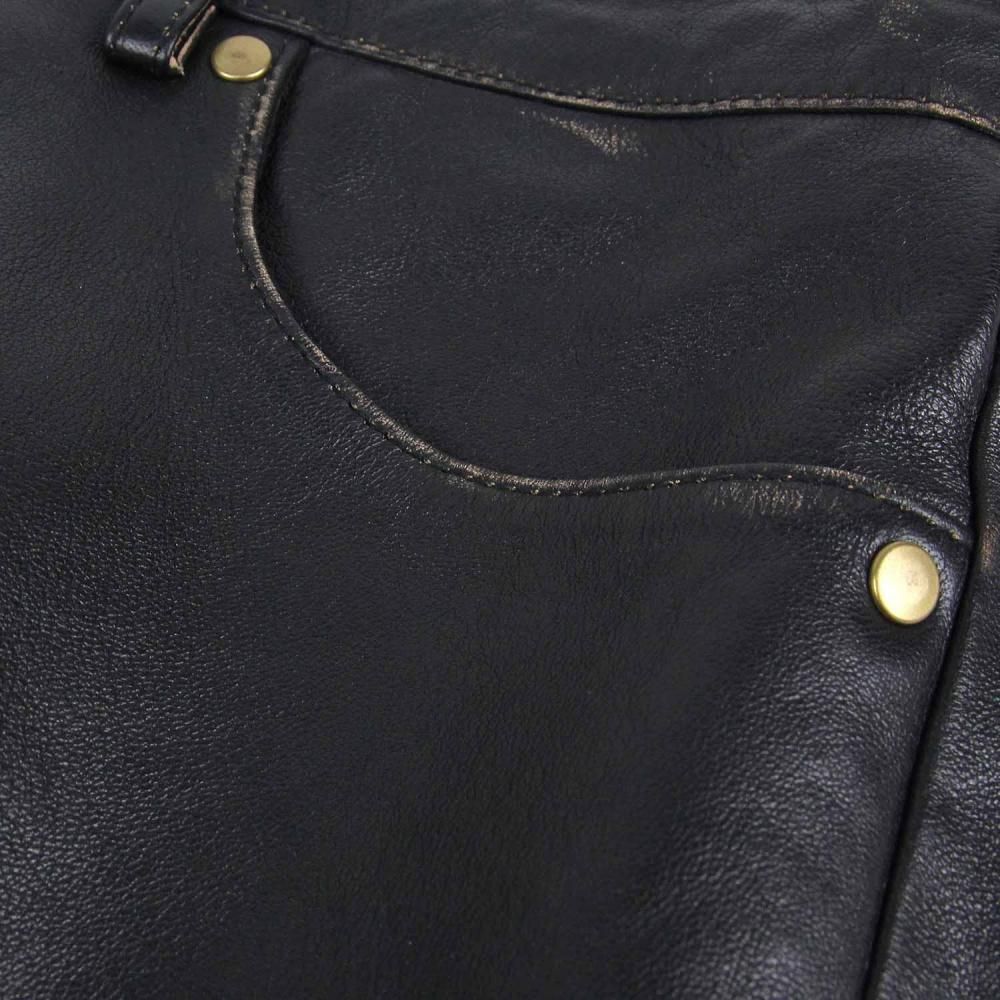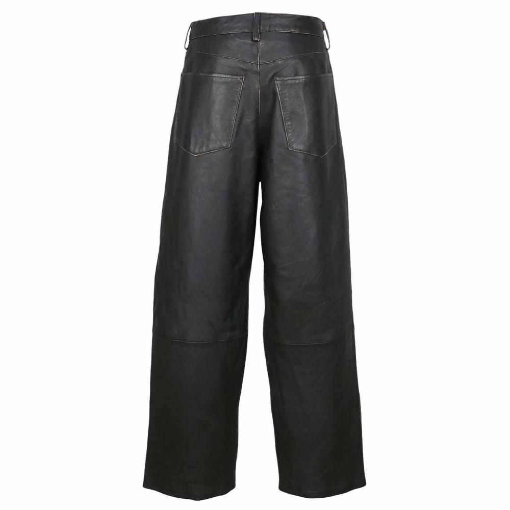 ウエストに対してワタリを広めに取り、ゆるくテーパードをかけたレザーパンツです。通常の5ポケットデザインに⽐べ、ゆったりとしたシルエットでリラッ