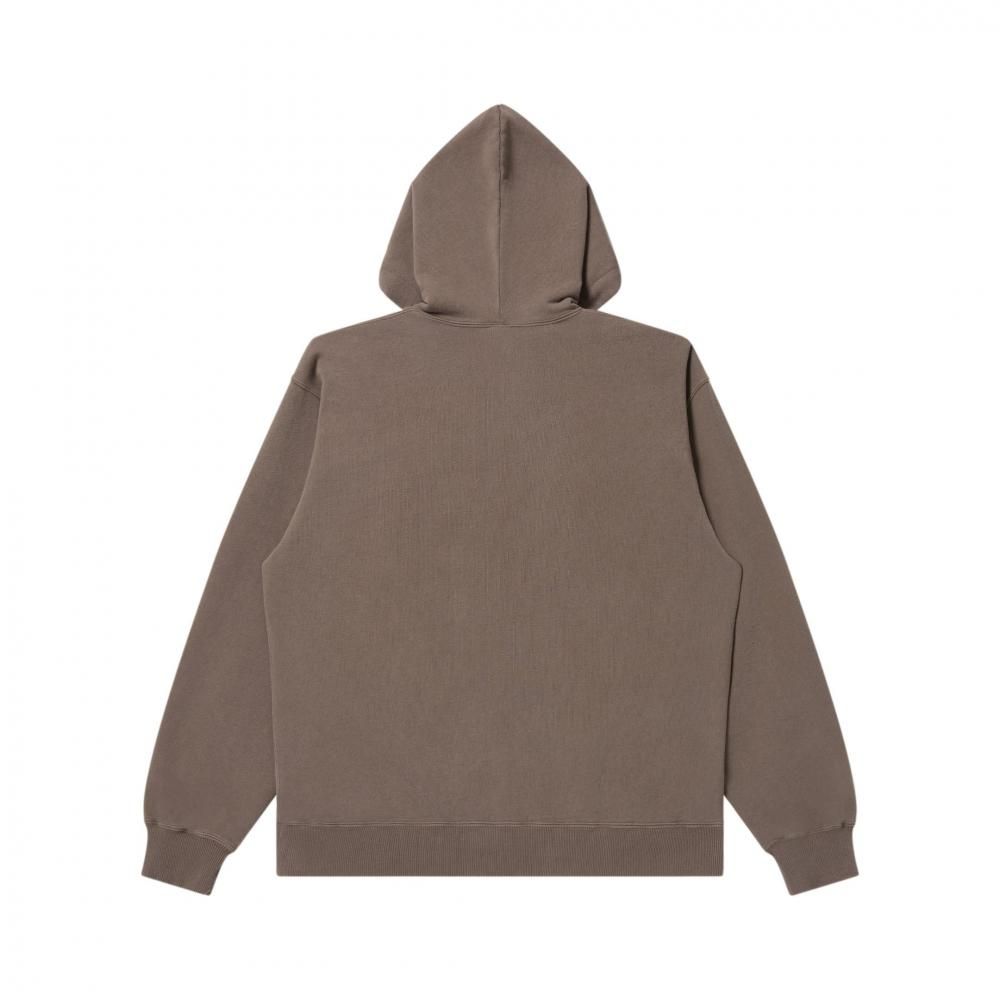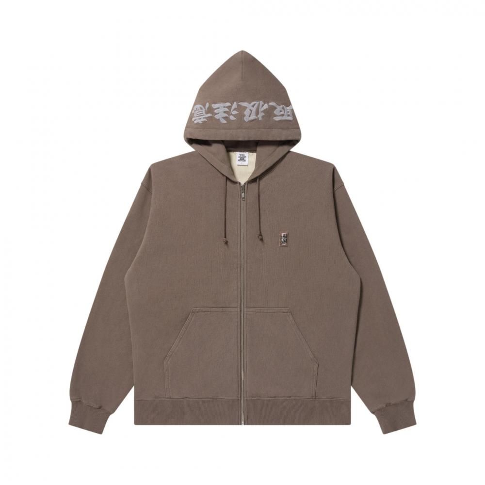 フード部分の "取扱注意" 部分をリフレクター糸で刺繍をした "SMALL HWC" ロゴワッペンのジップフーディー。