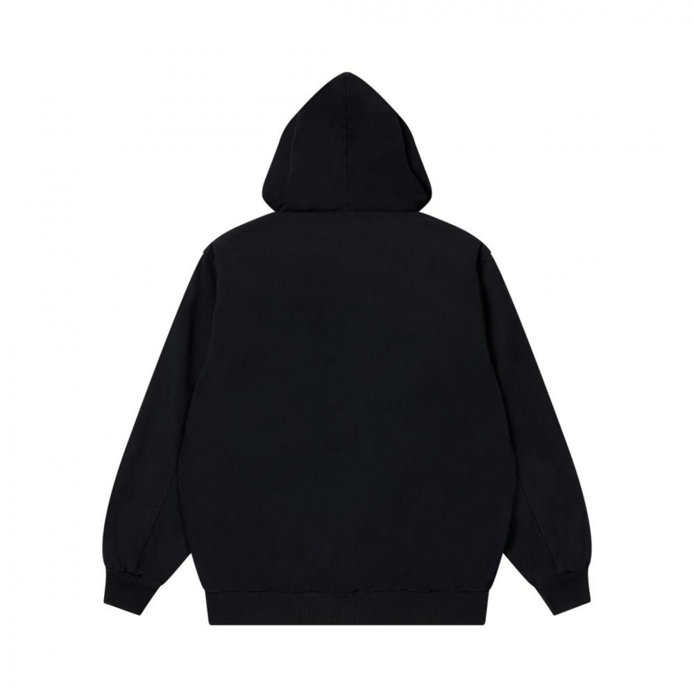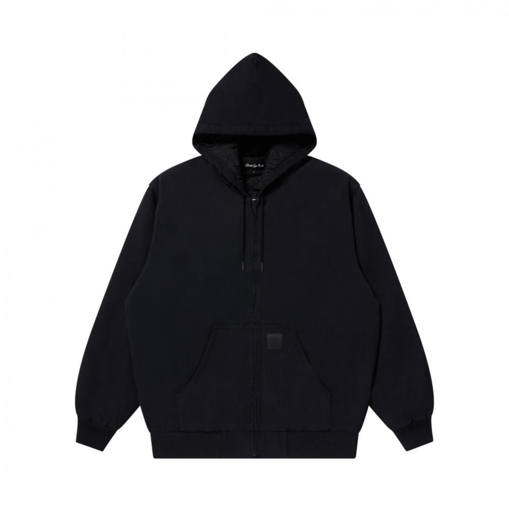 フロントにレザーワッペンを取り付けたウォッシュ加工を施したダック生地を使用したフーデットジャケット。