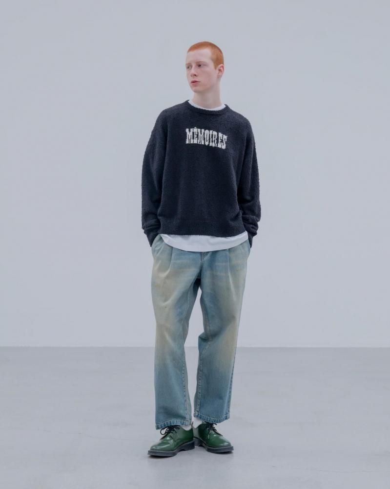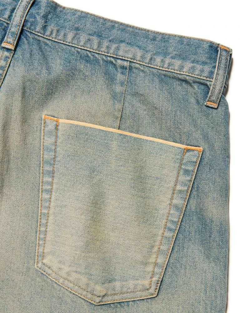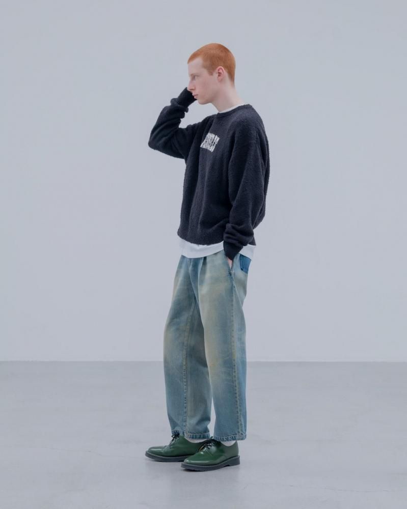 1タックを施し、今季のデニムコレクションの中でもかなりゆったりとしたルーズシルエットに仕上げたダメージジーンズ。穿き心地の良い11.5オンスのライトなデニム素材を採用しつつ、特殊な硫化染色による大胆なフェード感やバックポケットを加工後に外して色落ちしていない部分もあえて見せるなどUEらしい遊びを随所にきかせています。