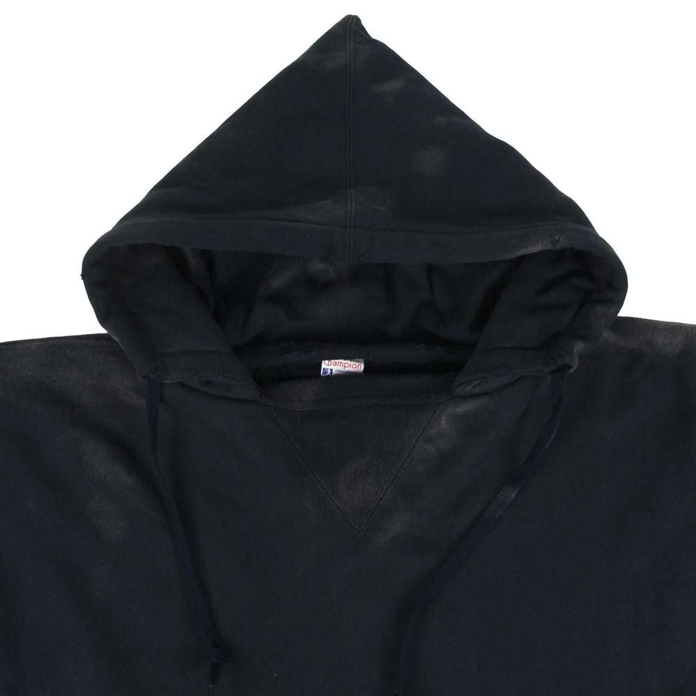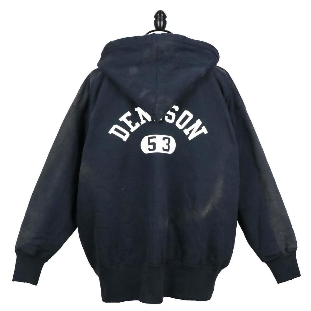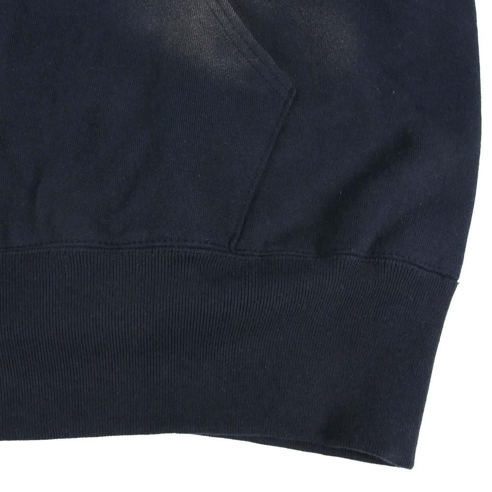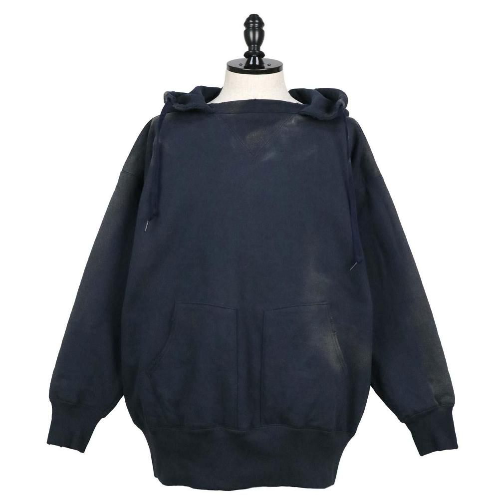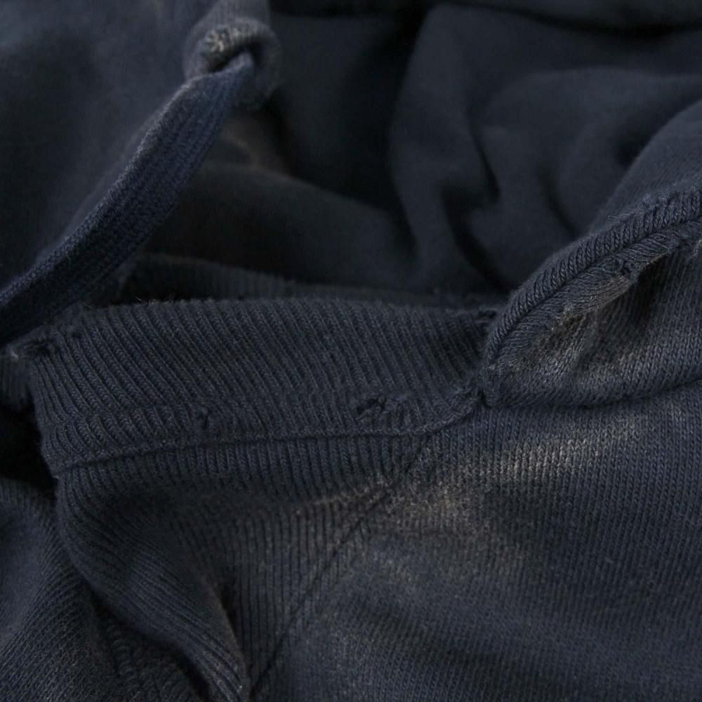 1950年代半ばにアスレチックラインとして販売されたアイテムの復刻版。裏起毛素材を二重構造にしてかさを上げ、寒い季節にも対応する保温性を持たせたダブルシックネス プルオーバーアフターフーデッドスウェットシャツです。当時の生地を忠実に再現したコットン100%の生地を使用。脇接ぎのない丸胴仕様や筒状の袖リブ、襟のリブにフードを挟み込んだ通称「後付けパーカー」、前後の襟に入れた「GUSSET(ガゼット)」など、当時の仕様を再現しています。旧式のシンカー編み機で編み立てた独特のボリューム感と風合いが特徴です。ヴィンテージ加工によって、経年劣化した色合いや風合いを表現。プリントは実在のヴィンテージ商品のデザインを踏襲。シルバーグレーのボディには染み込みプリント、ネイビーのボディにはプラスチゾルプリントを使用しています。左袖にCロゴワッペンが付いていない点も当時の仕様そのままです。