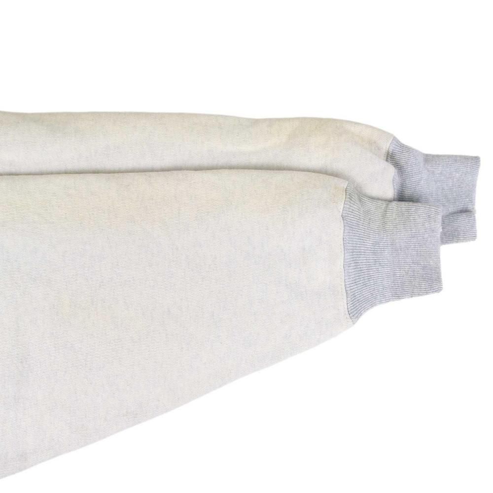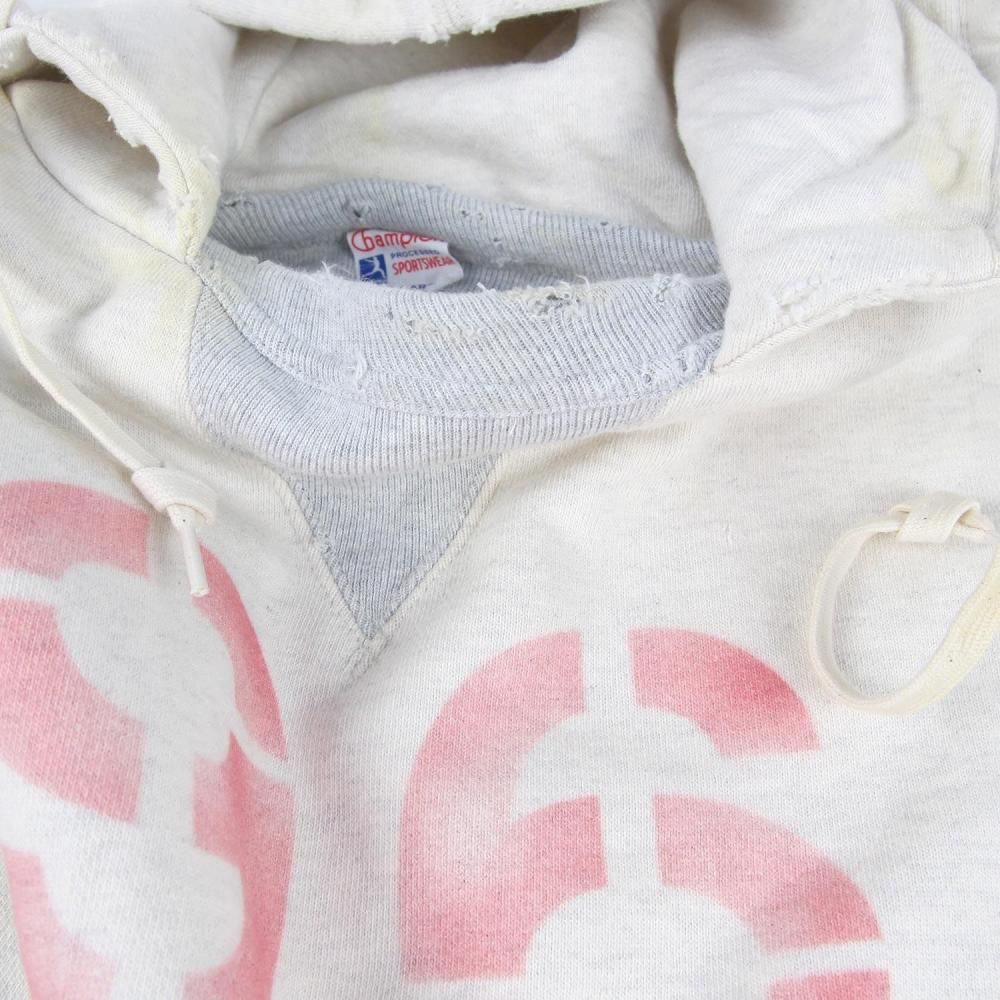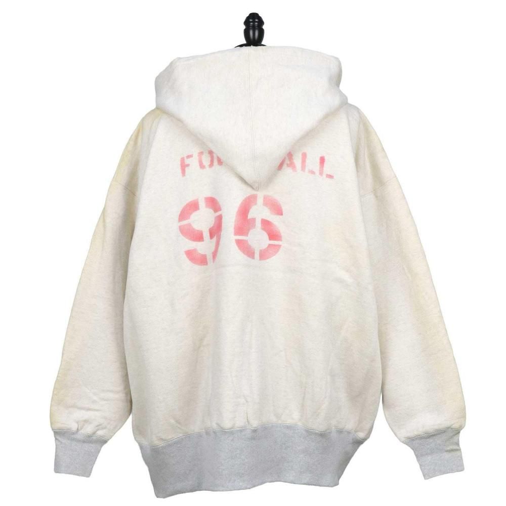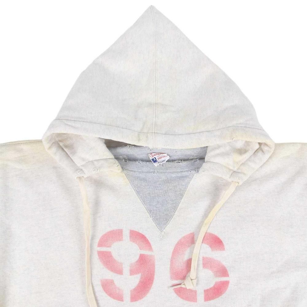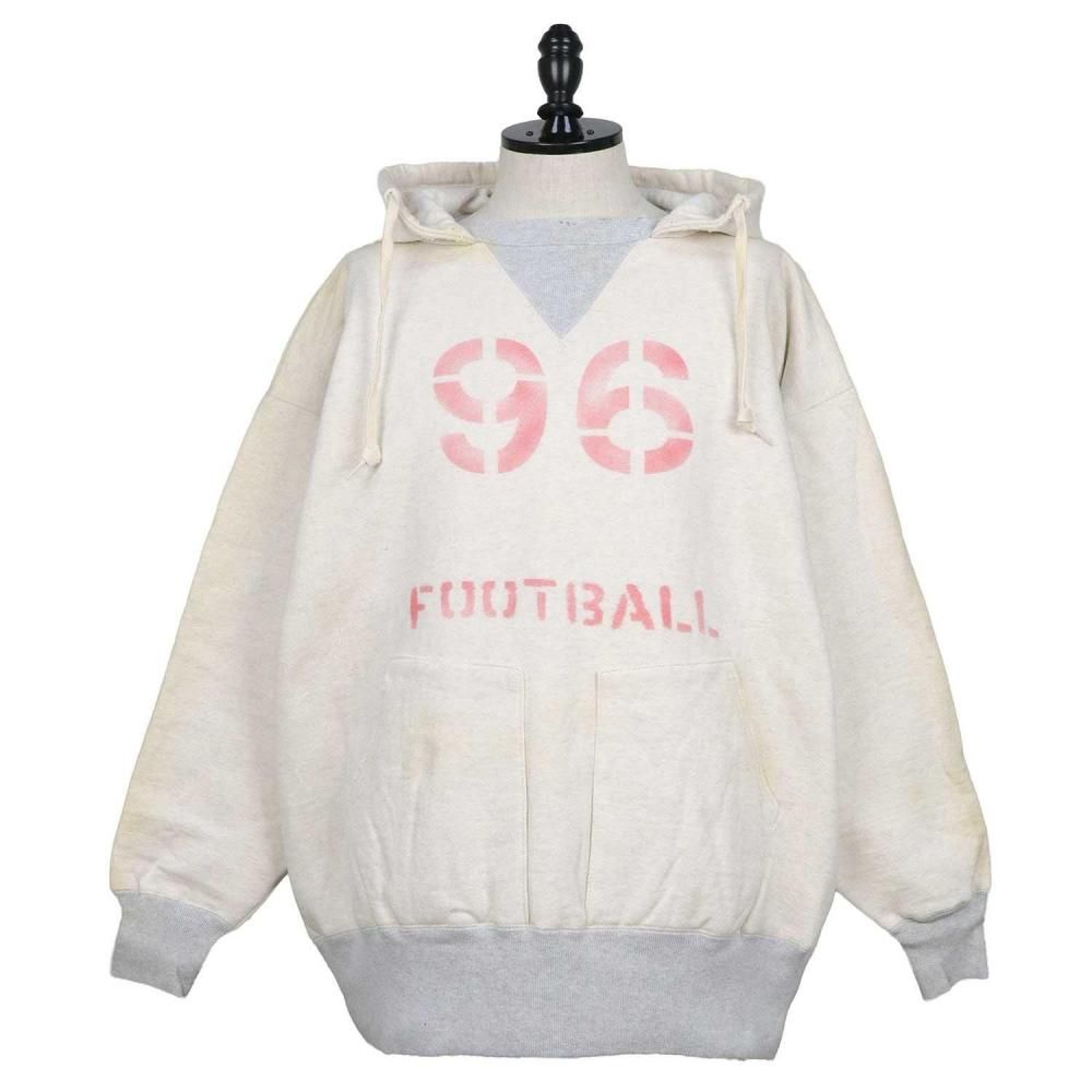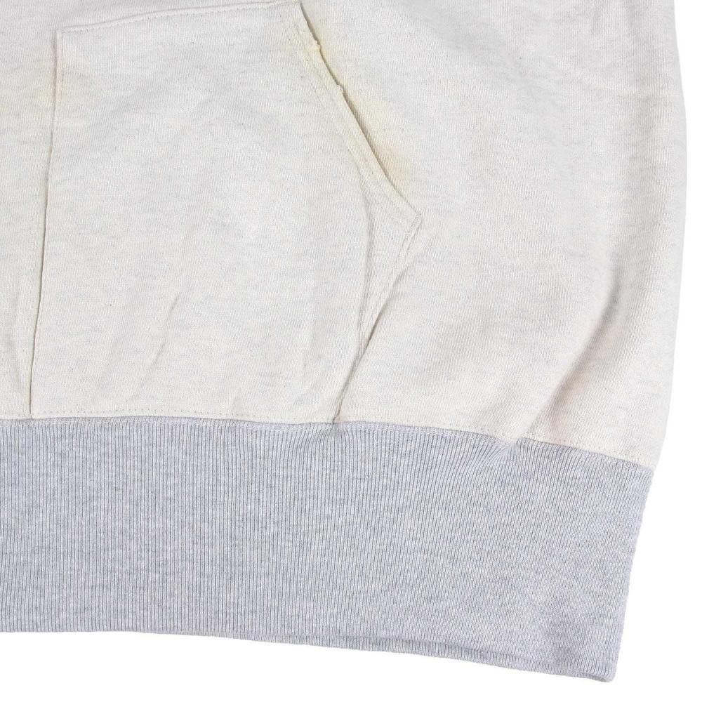 1950年代半ばにアスレチックラインとして販売されたアイテムの復刻版。裏起毛素材を二重構造にしてかさを上げ、寒い季節にも対応する保温性を持たせたダブルシックネス プルオーバーアフターフーデッドスウェットシャツです。当時の生地を忠実に再現したコットン100%の生地を使用。脇接ぎのない丸胴仕様や筒状の袖リブ、襟のリブにフードを挟み込んだ通称「後付けパーカー」、前後の襟に入れた「GUSSET(ガゼット)」など、当時の仕様を再現しています。旧式のシンカー編み機で編み立てた独特のボリューム感と風合いが特徴です。ヴィンテージ加工によって、経年劣化した色合いや風合いを表現。プリントは実在のヴィンテージ商品のデザインを踏襲。シルバーグレーのボディには染み込みプリント、ネイビーのボディにはプラスチゾルプリントを使用しています。左袖にCロゴワッペンが付いていない点も当時の仕様そのままです。