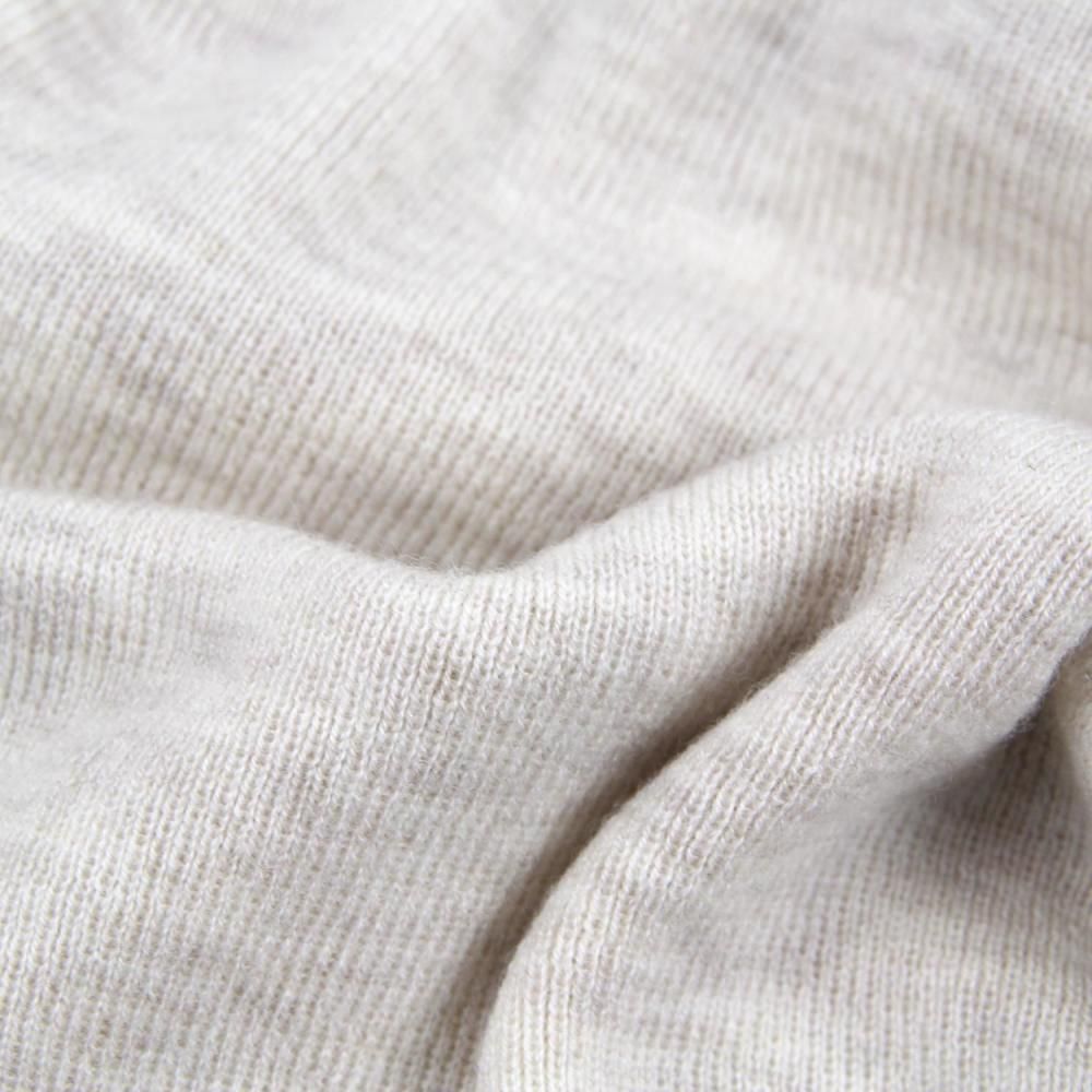 WOOL100%の細番手原料としては、かなり繊維が細く高品質の素材であるので、チクチクがなく肌触りも極上です。また、シルケット加工が施されている点も非常に大きなポイントです。シルケット加工によって上品な光沢感・ソフトでしなやかな肌触りがより深まっています。この糸はセミ梳毛なので、軽くなり易い上にシルケット加工によって梳毛並みの美しい表情を出してくれ、高品質ながらコストパフォーマンスにも優れています。繊細な糸ながらご家庭で手洗い可能なアイテムが作れる非常に価値のある素材です。