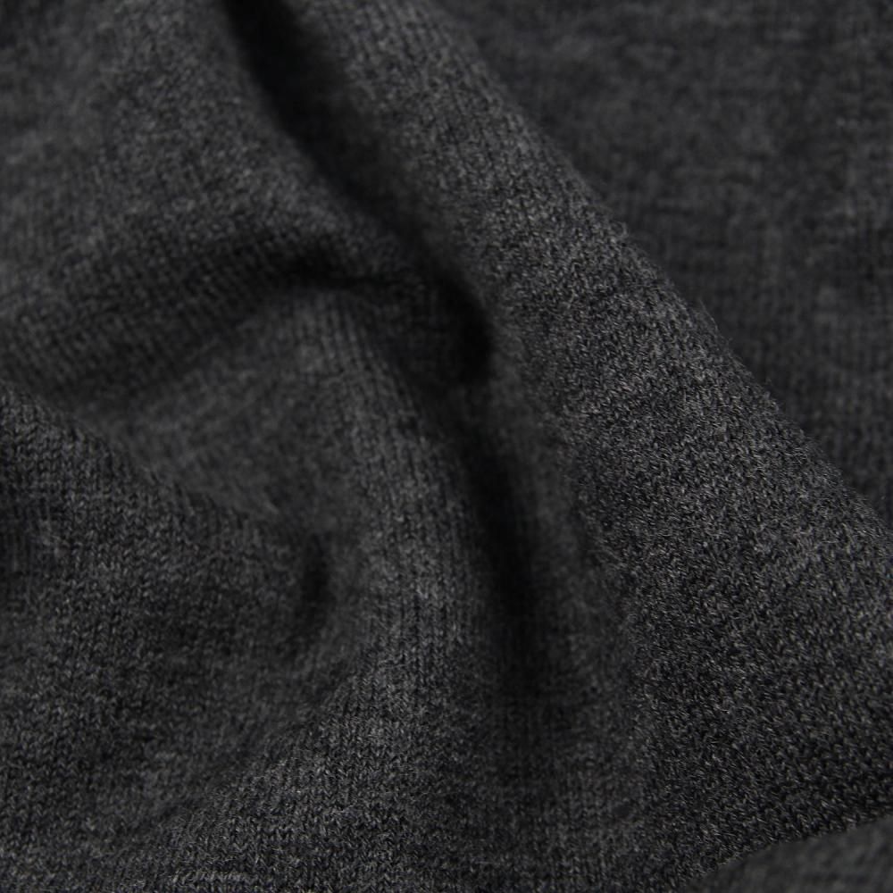 しなやかで非常に肌触りの良いハイゲージのニット。最大の特徴はスーパーファイン・メリノを使用したセミ梳毛糸という点です。かなり繊維が細く高品質の素材であるので、チクチクがなく肌触りも極上です。また、シルケット加工が施されている点も非常に大きなポイントです。シルケット加工によって上品な光沢感・ソフトでしなやかな肌触りがより深まっています。この糸はセミ梳毛なので、軽くなり易い上にシルケット加工によって梳毛並みの美しい表情を出してくれ、高品質ながらコストパフォーマンスにも優れています。繊細な糸ながらご家庭で手洗い可能なアイテムが作れる非常に価値のある素材です。