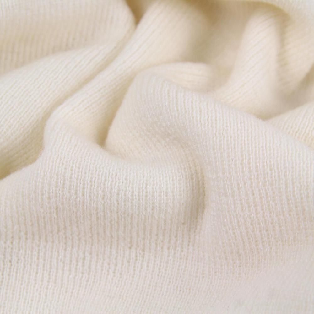 WOOL100%の細番手原料としては、かなり繊維が細く高品質の素材であるので、チクチクがなく肌触りも極上です。また、シルケット加工が施されている点も非常に大きなポイントです。シルケット加工によって上品な光沢感・ソフトでしなやかな肌触りがより深まっています。この糸はセミ梳毛なので、軽くなり易い上にシルケット加工によって梳毛並みの美しい表情を出してくれ、高品質ながらコストパフォーマンスにも優れています。繊細な糸ながらご家庭で手洗い可能なアイテムが作れる非常に価値のある素材です。