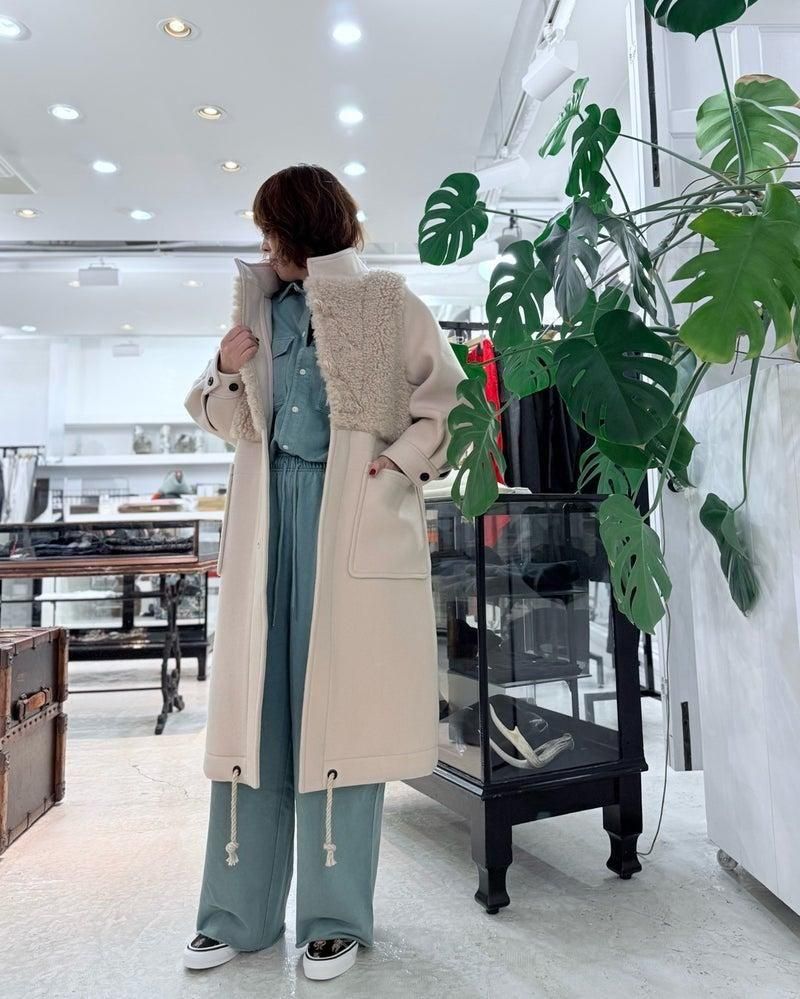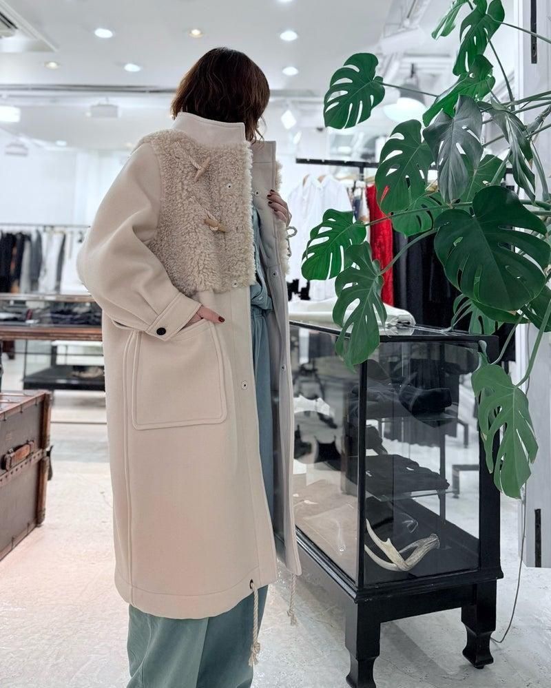 人気のダッフルコートに、上半身身頃にポリエステルファーがデザインされました。