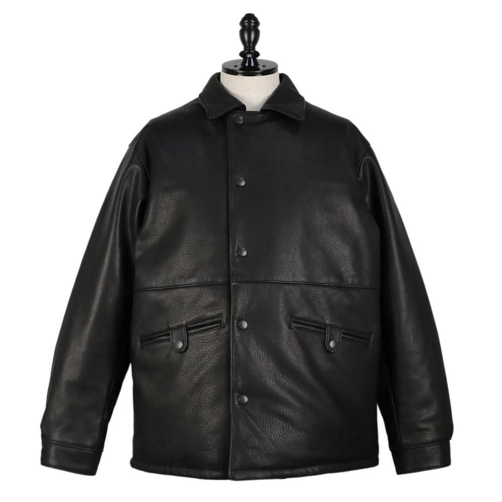 シボ感のあるレザーを贅沢に使用した中綿入りカーコートは、UNUSEDらしいゆとりあるボックスシルエットと、肩の収まりの美しさが際立つ一着。